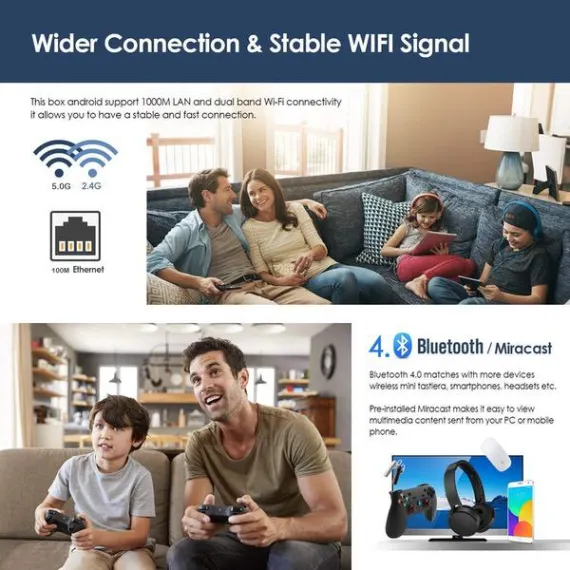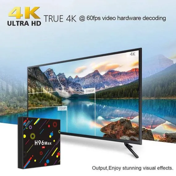 - H96 Max Android Box built-in 2.4G 5G dual band wifi and Bluetooth, support DLNA, 3D Movie, put everything you like on to the big screen television, is a good partner of your projector and 4K large screen TV