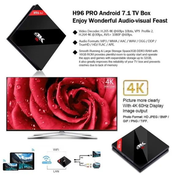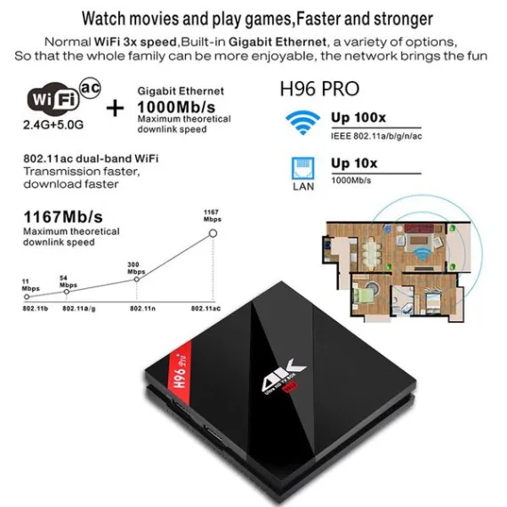 - ♧Big Screen Experience: This H96 pro tv box support DLNA, 3D Movie, put everything you like on to the big screen television, is a good partner of your projector and 4K large screen TV