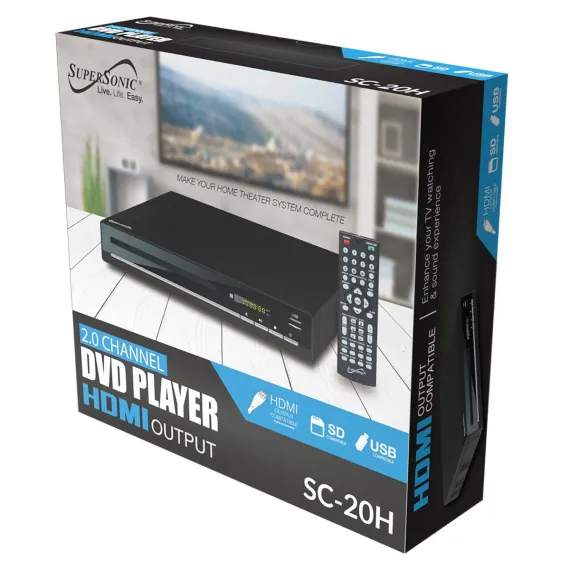 The Supersonic SC-20H 2.0-Channel Standard-Definition DVD Player is compatible with DVD, VCD, KODAK CD, DVD±R/RW video formats and CD, CD-R, CD-RW and MP3 audio formats. It can also accept USB drives and SD Cards. With an HDMI output, component and composite outputs, this DVD player can become the central media hub of your home theater system.