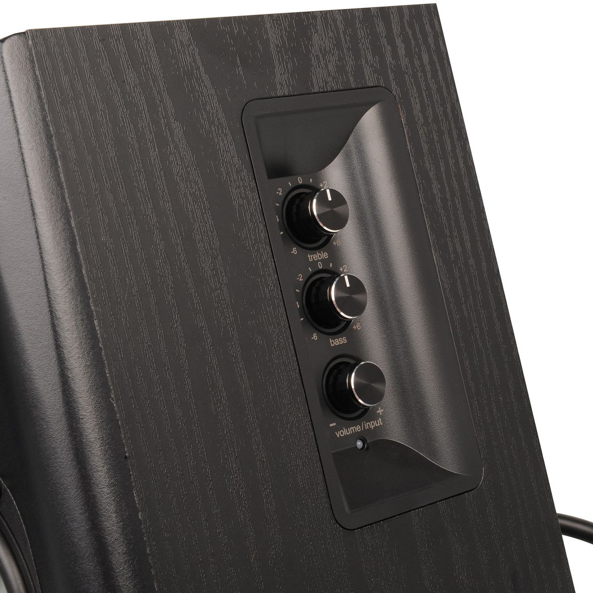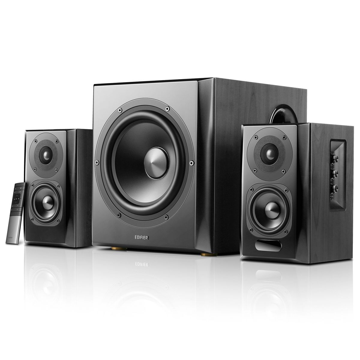 The Edifier® S351DB 2.1 Multimedia Bookshelf Speaker System offers old-school style with modern sound. Enrich your audio with crisp, clear highs provided courtesy of our high-quality titanium dome tweeters. Deep, rich lows are a highlight of this 8-in. bass subwoofer unit so you get sound that really shakes things up. Take full control of your audio with the side panel controls on the side of the active bookshelf speaker. 3 knobs are located on the side that affect the bass, treble, and volume for the entire 2.1 system.