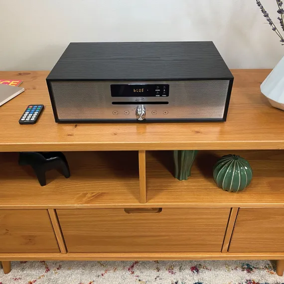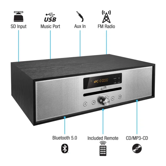A modern twist to a classic style brings you this all-in-one Bluetooth Home Music System from iLive Electronics™. Listen to your playlist using Bluetooth, 3.5 mm aux input, USB drive, or SD Card, or pop in some of those old CDs and reminisce. Take it easy and relax while you listen to your favorite radio stations with the built-in FM radio and control it all from the comfort of your couch using the included remote.