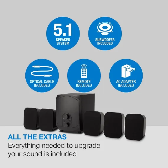 Complete your home theater experience with this 5.1 speaker system. Five satellite speakers and a powerful subwoofer deliver cinematic movies, immersive games, and exciting music concerts – all in the comfort of your living room. Bluetooth 5.0 makes it easy to blast music from a laptop, tablet, or smartphone and enjoy the same room-filling sound. The included optical cable and remote make setup and operation a breeze.