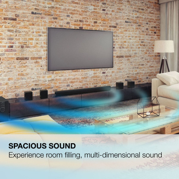Give all your media a boost with immersive surround sound capabilities. This 5.1 channel powered speaker system features 6 surround speakers: subwoofer, front left & right, surround left & right and 32" sound bar. You can design more than just the soundscape with the wall-mountable soundbar and satellite speakers. Along with Bluetooth wireless connection, you can use the HDMI or optical input for a more direct sound.
