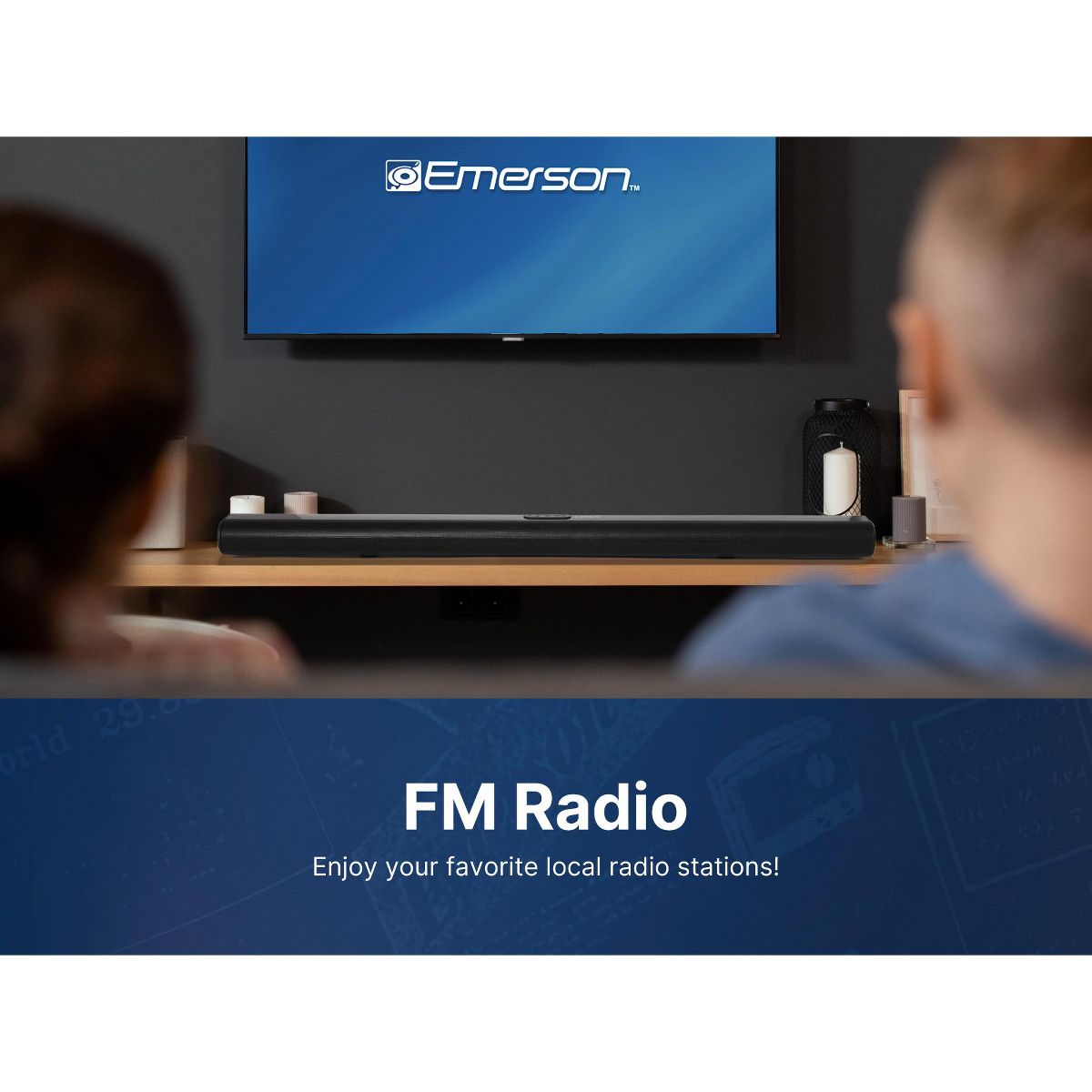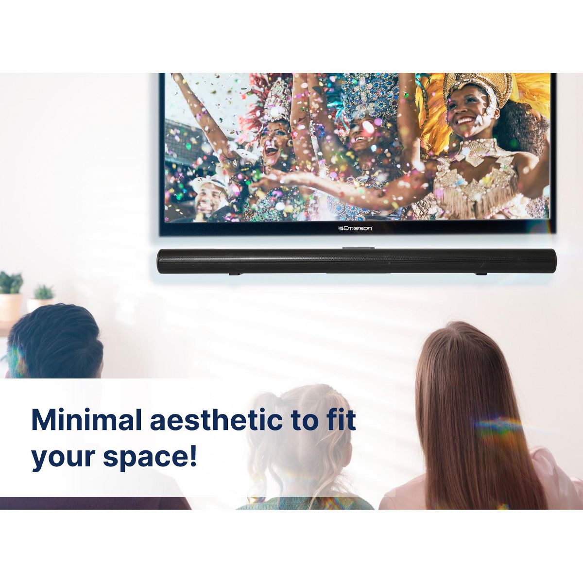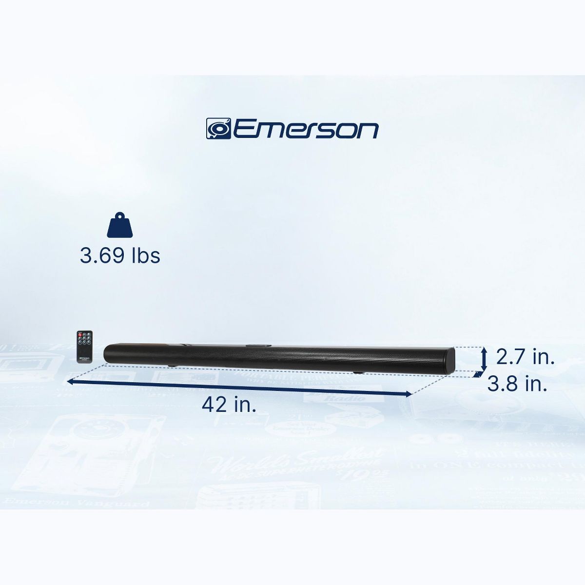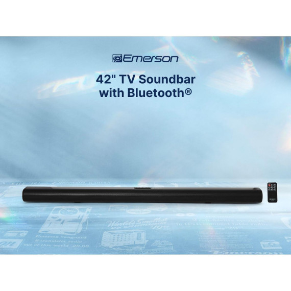Elevate your audio experience at home with Emerson's advanced wireless soundbar system. The Emerson™ 42-inch wireless sound bar system with Bluetooth® and NFC connectivity, two full-range drivers delivering 20W RMS output power, and various input options, including Optical digital audio, RCA stereo audio, and 3.5mm AUX audio. This versatile system can be mounted to a wall or displayed on a desktop and includes accessories such as a remote control, AC power adapter, RCA stereo cable, 3.5mm AUX cable, wall mount screws, and user manual for easy set-up and use.