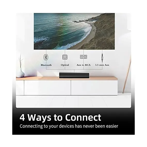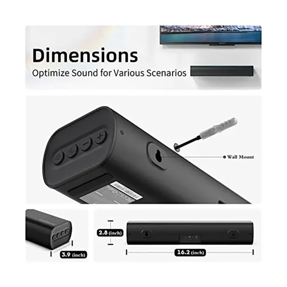 Elevate your TV viewing experience with this 16 - inch sound bar. With 50 Watts of power and 2 large bass radiator units, it offers deep, impactful bass and room - filling sound. Connect it easily to your TV via Bluetooth, Optical, 3.5 mm Aux, or 3.5 mm Aux to RCA. The built - in DSP technology provides 3 EQ modes for different scenarios like movies, music, and news. You can control it using the side buttons or the included remote. Its compact design allows for easy placement under the TV or wall mounting. And all the necessary accessories are included, so you don't have to worry about sourcing extra parts. Whether you're watching a movie, listening to music, or catching up on the news, this sound bar will provide an excellent audio experience.