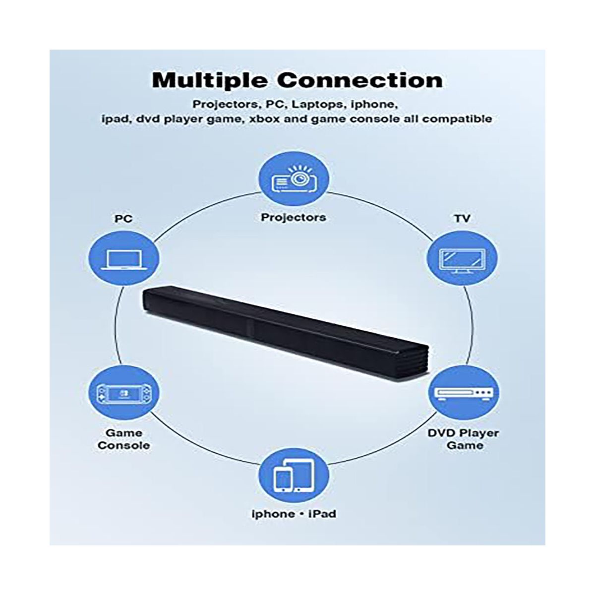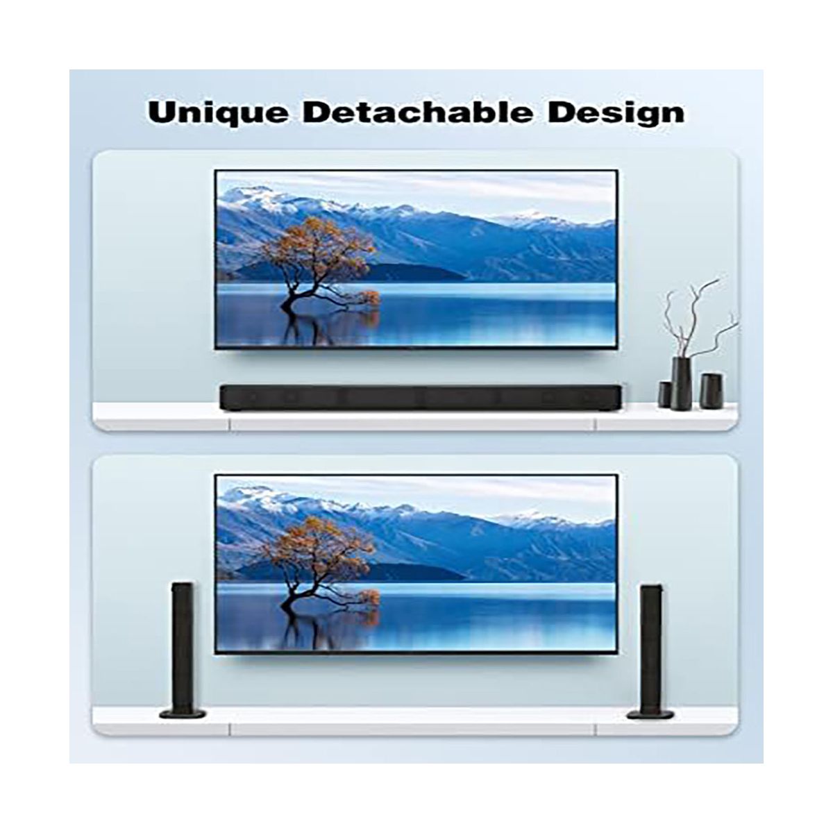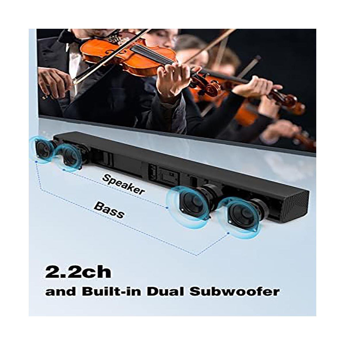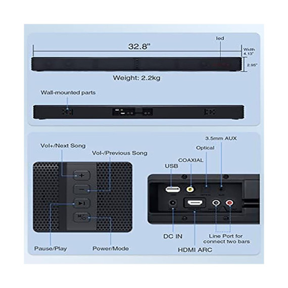 Upgrade your home entertainment with this 2 - in - 1 soundbar! It features a 2.2 - channel system with a built - in dual subwoofer and Bluetooth 5.0 technology. The innovative 2 - in - 1 detachable design gives you the flexibility to use it as a single unit or separate the speakers for a better stereo effect. With two tweeters and dual sub - woofers, it delivers 3D stereo surround sound, providing distortion - free audio at maximum volume. Connecting is a breeze with the included HDMI ARC cable and multiple connection ports like USB, AUX, Optical, and Coaxial. You can choose from 10 different EQ modes using the DSP technology and control everything with the included remote. Whether you're watching movies, listening to music, or gaming, this soundbar will enhance your experience. It comes with all the necessary accessories, making it a comprehensive package for your entertainment needs.