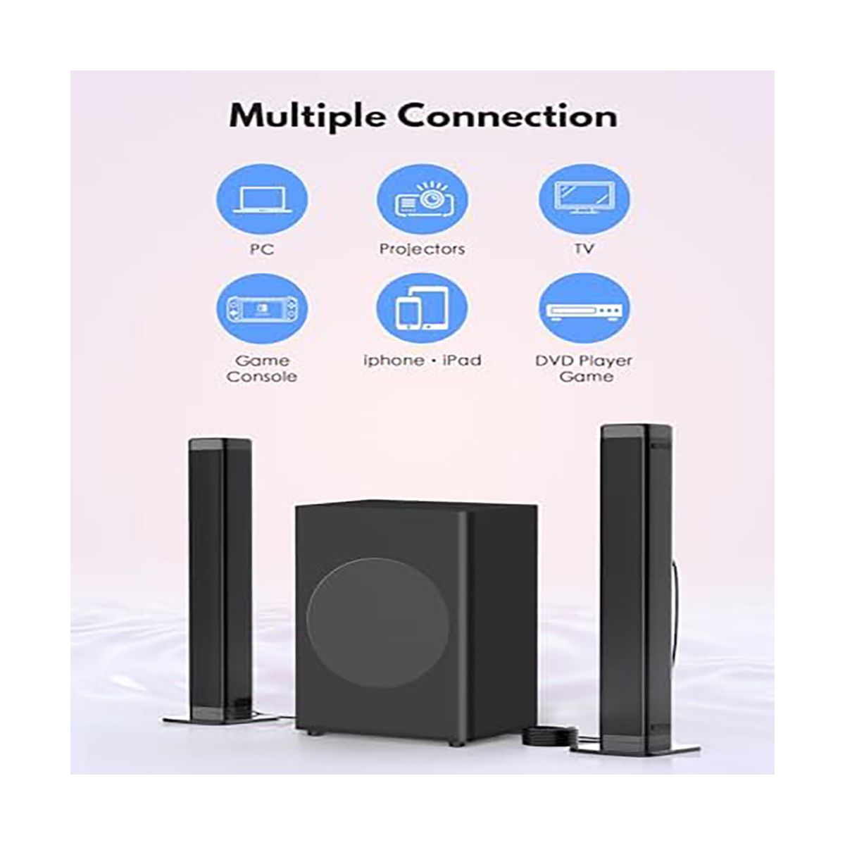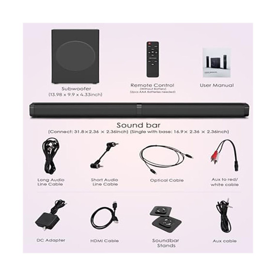 Upgrade your home entertainment with this 2 - in - 1 sound system. It features a detachable soundbar and a 6.5’’ subwoofer. The system offers 10 EQ modes for customized sound. Setup is a breeze; just plug in the components and enjoy powerful sound within minutes. Connect wirelessly via Bluetooth 5.0 to your devices. Whether you're watching movies, playing games, or listening to music, this sound system provides crystal - clear dialogue, rich midrange, and immersive surround sound. The sleek design fits seamlessly into any home decor. It comes with a full set of accessories like speakers, cables, and a remote control. For optimal use, manually adjust TV audio output if needed. Enhance your living space and entertainment experience with this high - quality sound system.