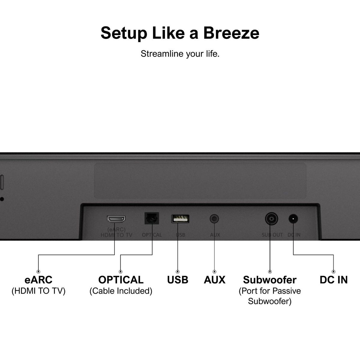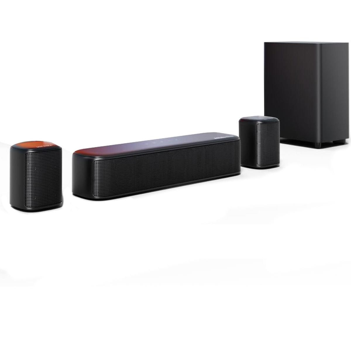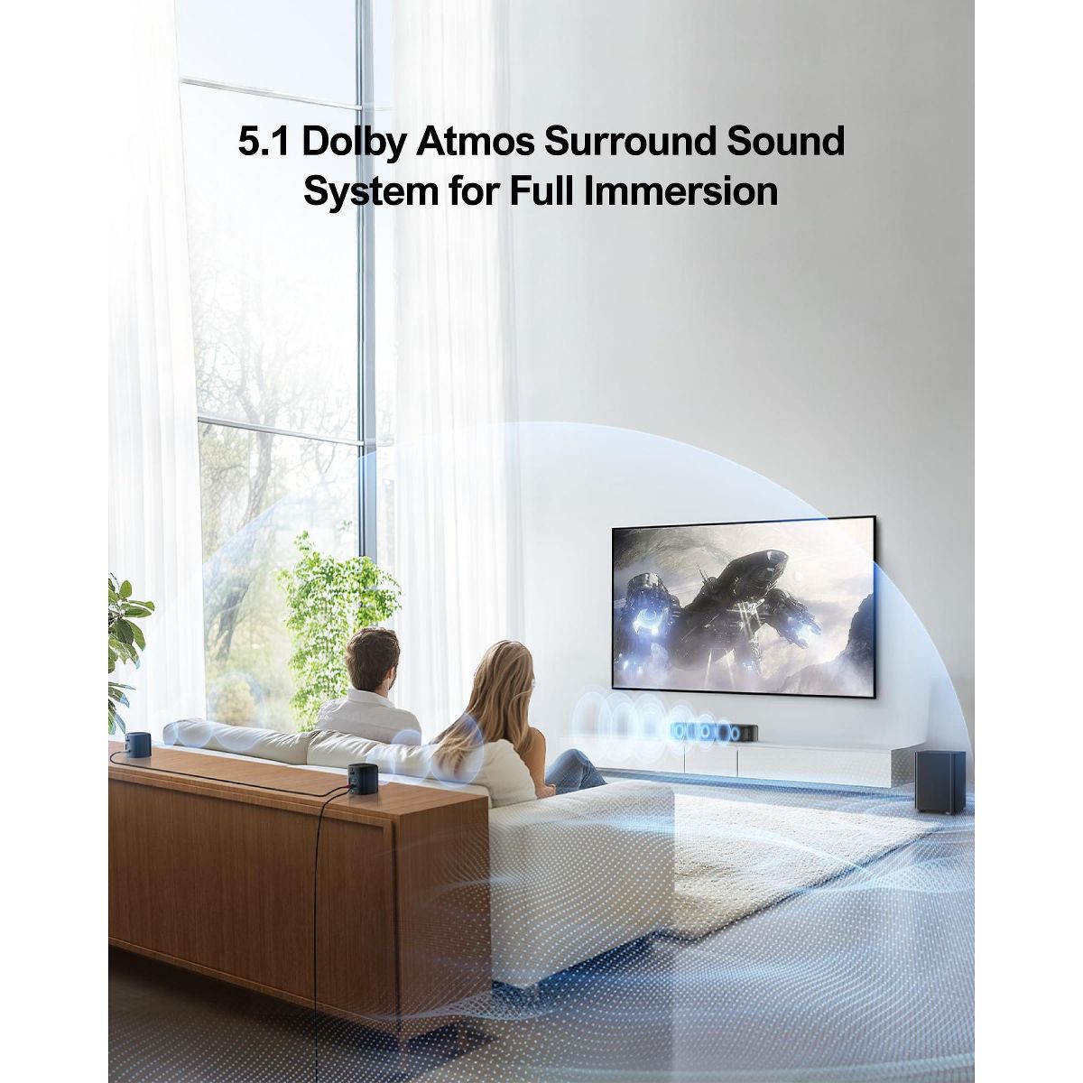 Upgrade your home entertainment with this 5.1ch sound system. It features Dolby Atmos technology for a 3D sound experience, making you feel like you're in a real cinema. The 5.1 channel setup, with three main channels, two surround speakers, and a 4" wired subwoofer, delivers clear dialogue, immersive surround sound, and powerful bass, perfect for spaces up to 215ft²/20m². The surround speakers use SurroundX technology, converting 2.0 PCM to 5.1 surround signal. The HDMI eARC ensures high - resolution, lossless audio transmission. With the app, you can customize your audio experience with 121 expert EQ presets and 6 tailored modes. The CEC synchronization simplifies control, allowing you to manage the TV and soundbar with a single remote. Whether you're watching movies, playing games, or listening to music, this sound system will bring a new level of enjoyment to your life.