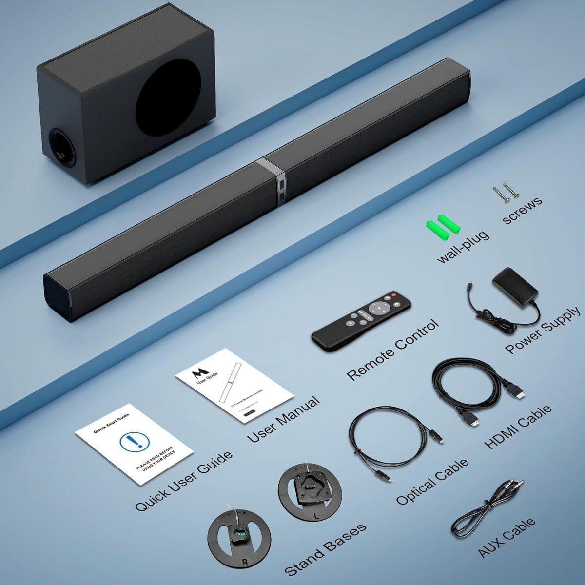 Our 120W Sound Bar with Subwoofer has impactful volume boost. Our Sound Bar for Smart TV elevates faint sounds to vibrant with auto volume boost. Experience immersive sound through 4 versatile placements—horizontal for distortion-free audio, vertical for room-filling sound, tabletop for vibrant clarity, and wall mount for 360° cinematic magic. Transforms your room into a personal theater. Powered by 4 high-performance drivers, 120W powerful sound output, our 5.0 Bluetooth Soundbar for TV with Deep Bass provide richer details, like soft whisper or subtle croon, whether deep thunder or sonorous roar, turn flat audioto vivid. Adjustable subwoofer add depth and realism, building tension in movies, adding weight to music, making the virtual game experience immersive. Our 2 in 1 Detachable TV Sound Bar fine-tune your listening experience with 3 dynamic equalizer modes—movie, music, and news. Enjoy rich, cinematic audio, luxurious melodies, and crystal-clear dialogue, tailored to enhance every scene and soundtrack. Adjustable Bass +/- also spread the audio evenly throughout a room, ensures that everyone, regardless of seating position, experiences the full range of sound. Our TV SoundBar is effortless to use. Enjoy seamless setup with cutting-edge Bluetooth 5.0 or reliable ARC, OPT, and AUX connections. In ARC mode, control your soundbar with ease using your TV remote, guided by our easy-to-follow instructions and video tutorials. Package Included: 1x Detachable Sound Bar, 1x Subwoofer, 1x Power Adapter, 1x ARC Cable, 1x Optical Cable, 1x 3.5mm AUX Cable, 1x Remote Control (no battery), 2x Bases.