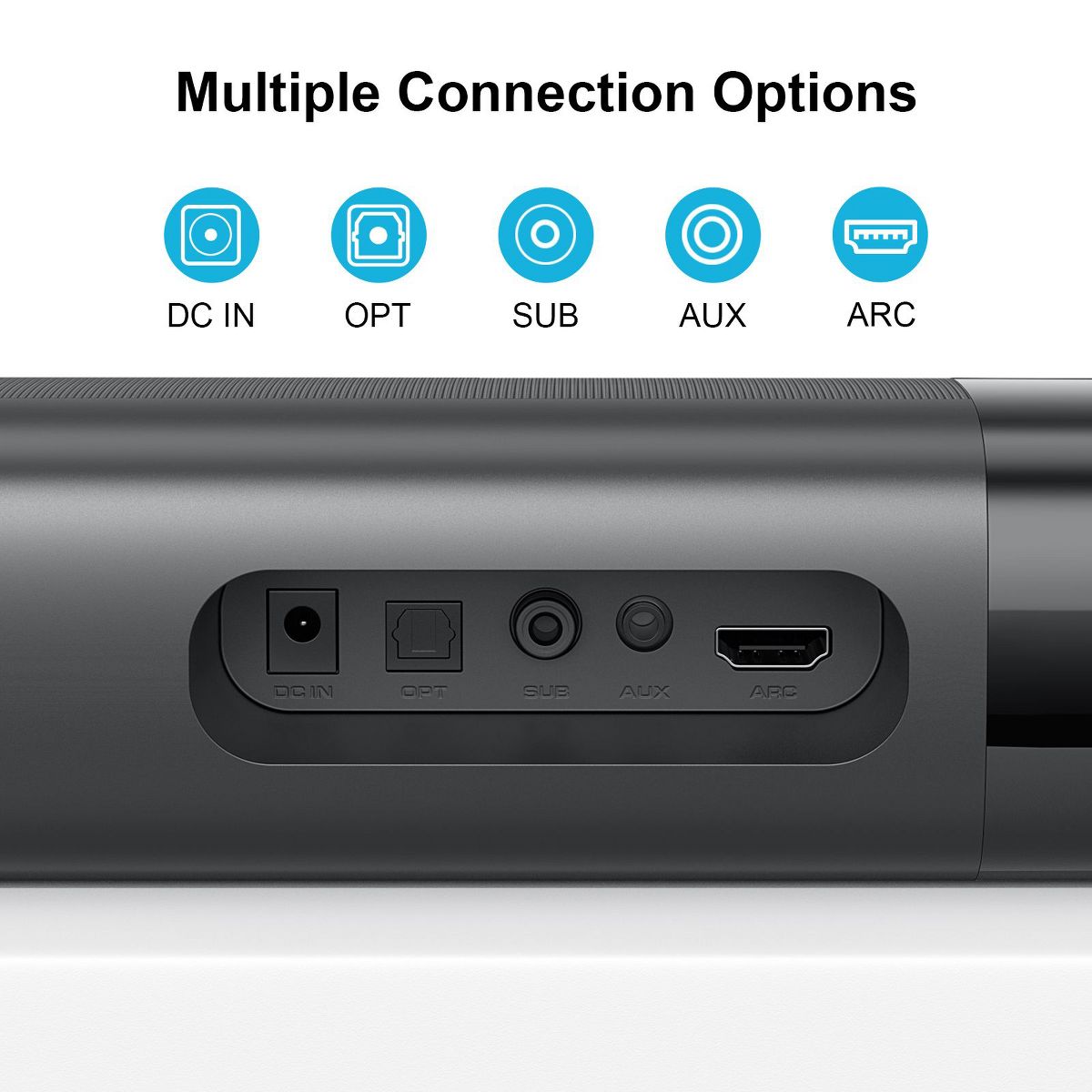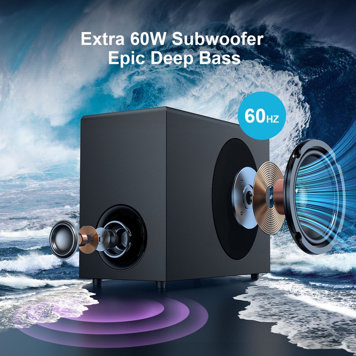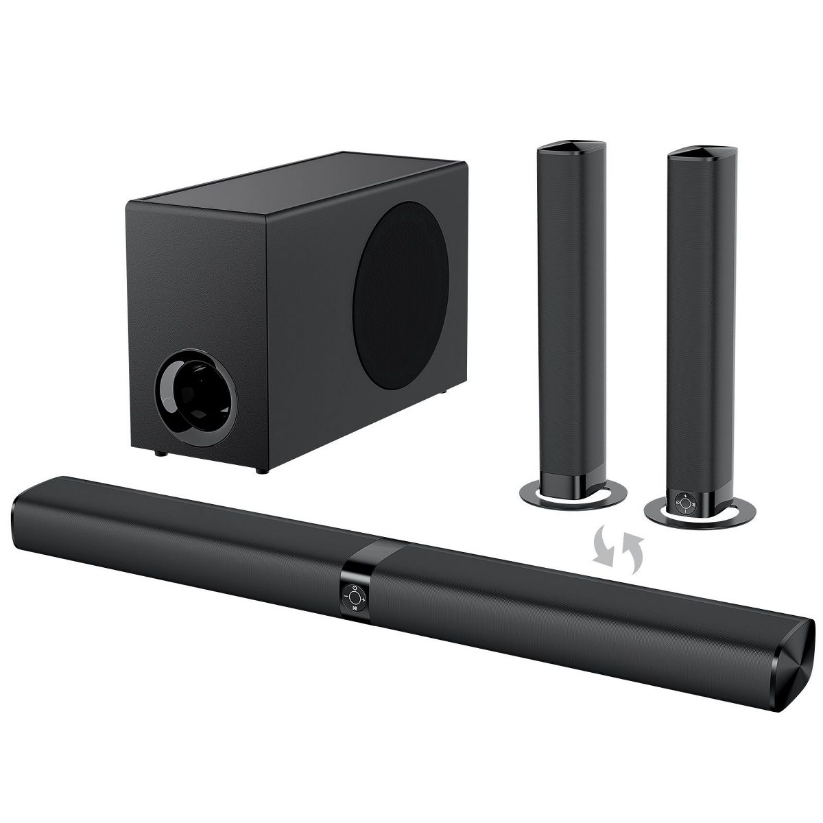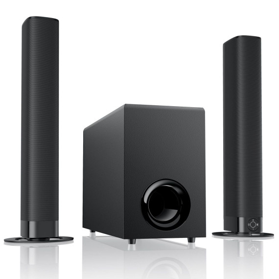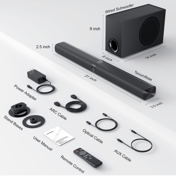 This soundbar set includes a 60W soundbar and a 60W subwoofer, with a total power of 120W. It is equipped with four high-performance driver units and a large-cavity subwoofer, capable of delivering powerful bass and seamlessly integrating dynamic surround sound to create a full-house sound effect, providing an immersive and thrilling experience for music, movies, and games (especially action scenes). Supports three equalizer modes for news, movies and music, as well as bass adjustment. With a remote control, you can customize the auditory experience to ensure balanced and full sound. It adopts Bluetooth 5.0 wireless connection and ARC/OPT/AUX wired connection, making it easy to adapt to devices such as TVS and computers, and quickly complete the setup. Package Included: 1x Detachable Sound Bar, 1x Subwoofer, 1x Power Adapter, 1x ARC Cable, 1x Optical Cable, 1x 3.5mm AUX Cable, 1x Remote Control (no battery), 2x Bases. When in use, please pay attention to the TV audio output Settings and interface adaptation. When using ARC or optical fiber connection, please set the TV audio output to PCM. Before purchasing, if you are using HD-ARC mode, please ensure that your TV interface has the ARC/eARC logo to provide high-quality audio support for various audio-visual scenarios.