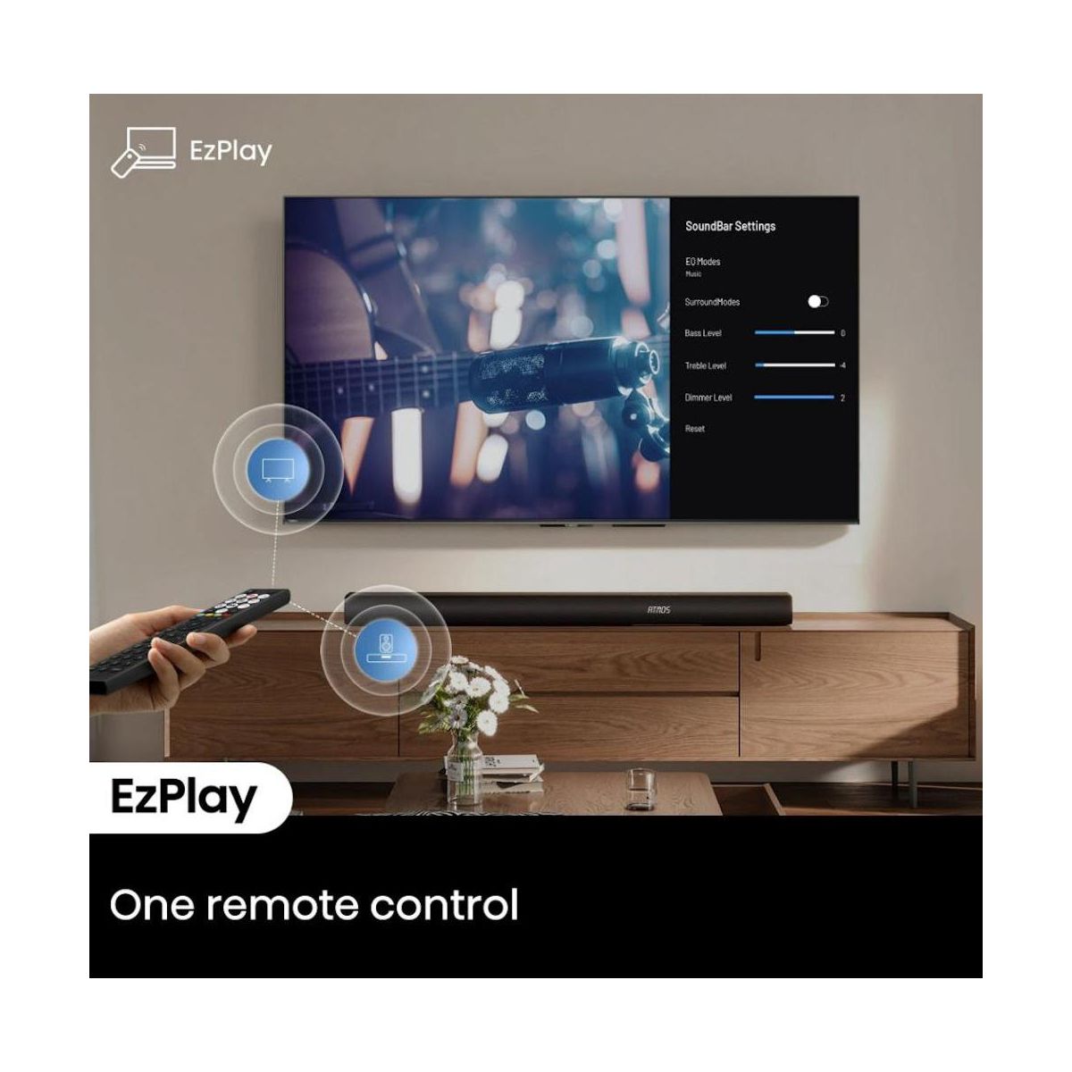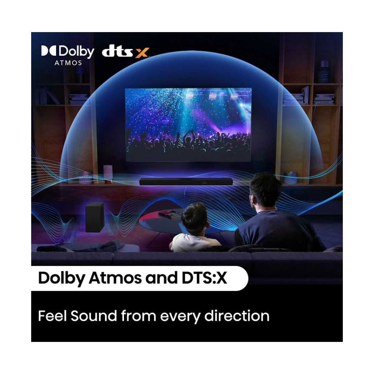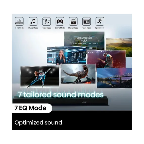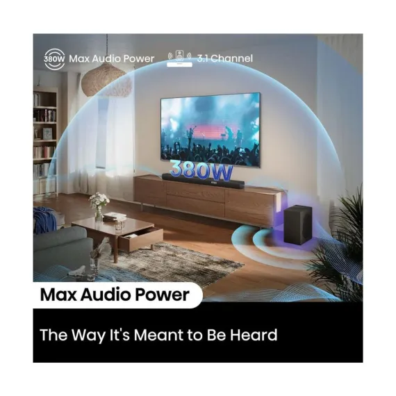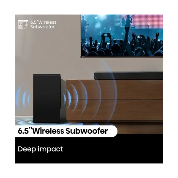 Upgrade your audio experience with the Hisense R632 3.1 channel soundbar and wireless subwoofer. The R632’s 380 watts of sound fills the room with a 5-speaker array that also projects sound overhead, making the most of Dolby Atmos for an immersive surround sound experience. With 7 audio enhancement modes—including news, movie, sports, game, and night—you can optimize sound specifically to the content or time of day. And eARC provides a simple one-cable connection with the included HDMI cable. Plus, Bluetooth audio makes it easy to connect your phone, tablet, or laptop wirelessly to enjoy music and more.
