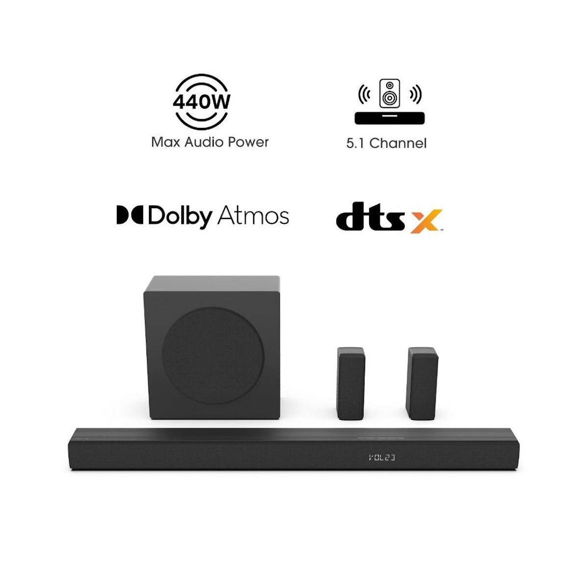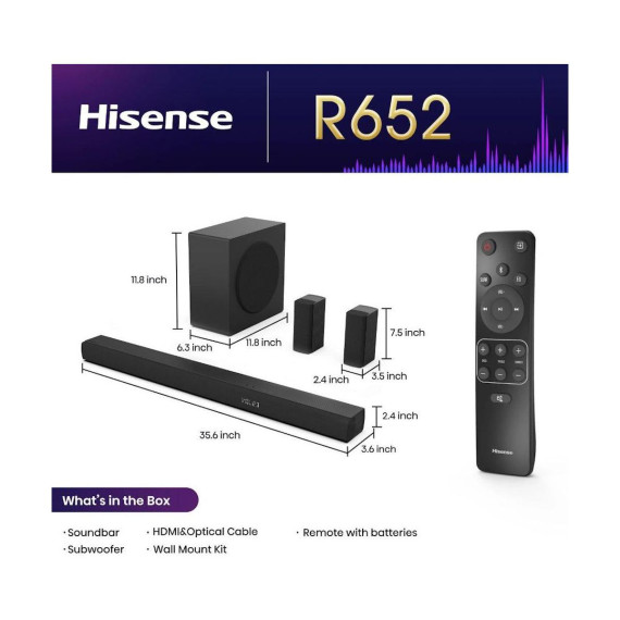 Hisense 5.1 Ch Soundbar R652 - 440W output, Rear Surround Speakers, 6.5” Wireless Subwoofer, Dolby Atmos, DTS Virtual X, Easy Connect