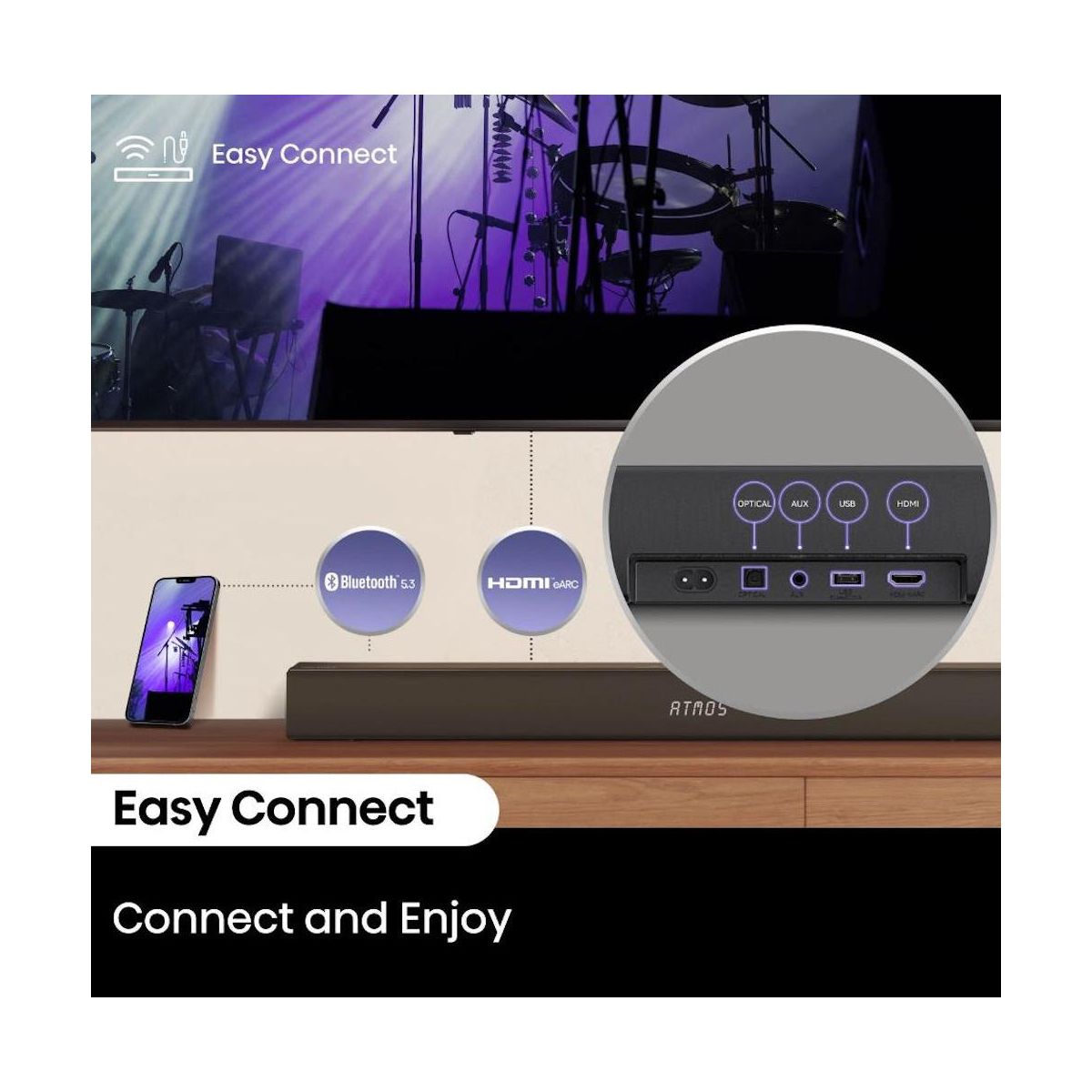 Upgrade your audio experience with the Hisense R652 5.1 channel soundbar and wireless subwoofer. The R652’s 440 watts of sound fills the room with a 7-speaker array that also projects sound overhead, making the most of Dolby Atmos for an immersive, surround sound experience. Featuring 7 audio enhancement modes—including news, movie, sports, game, and night—you can optimize audio to match your content or time of day. With eARC and the included HDMI cable, setup is easy with a single connection to your TV. Plus, Bluetooth audio lets you stream music, podcasts, or audiobooks from your phone, tablet, or laptop wirelessly.