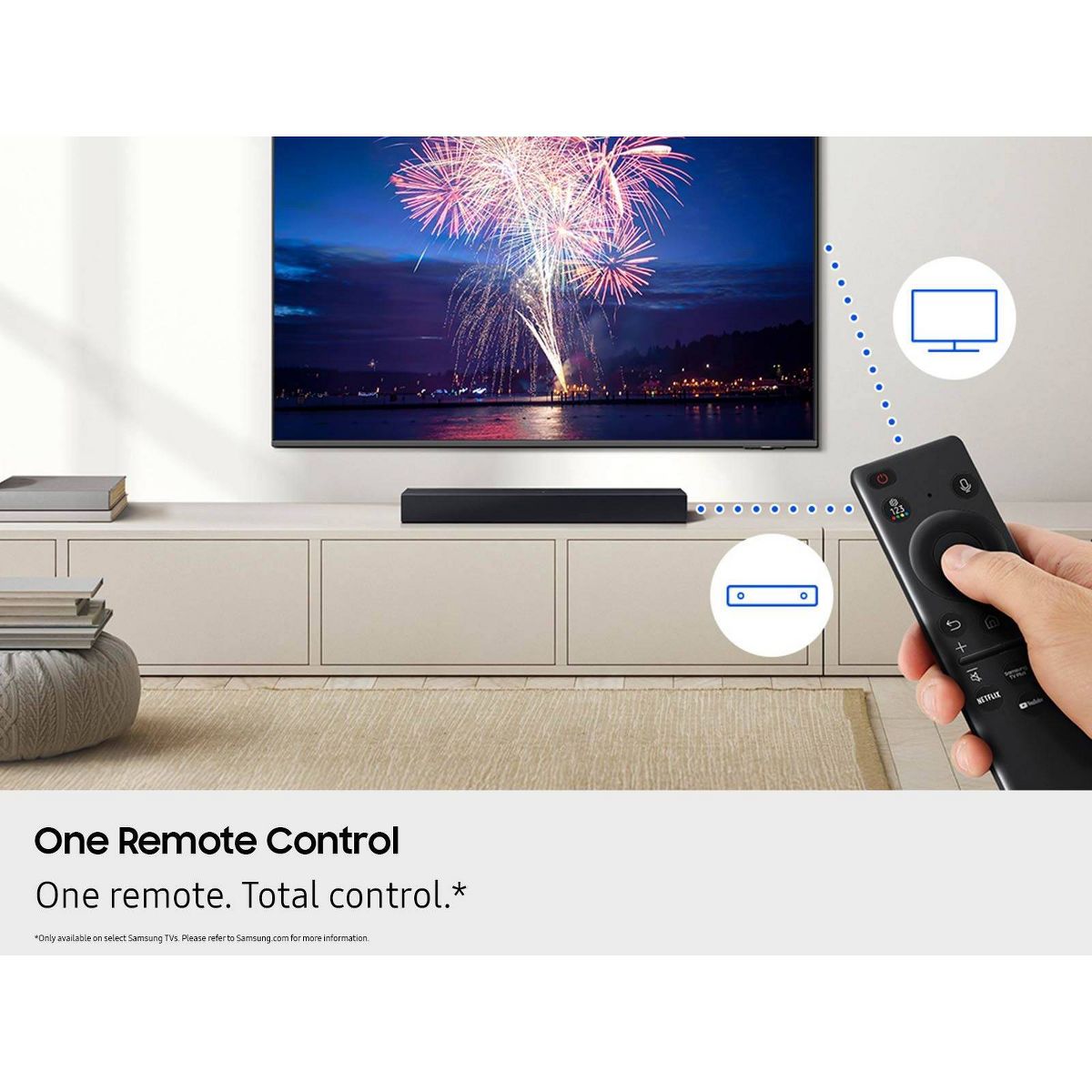All you need is one this soundbar delivers balanced audio and features a built in woofer so you can enjoy everyday content with robust, rich sound. Enjoy clearer voices in your shows and movies with automatically amplified dialogue, so you won't have to rewind or turn on the subtitles. Plus, you can simplify your home theater setup by controlling everything with your Samsung TV remote. Simple like that.