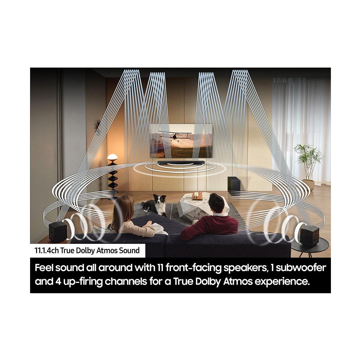 Turn your living room into a cinematic soundstage with the Samsung Q-Series 11.1.4-Channel Wireless Dolby Atmos Soundbar System. Engineered to deliver breathtaking, multidimensional audio, this premium system surrounds you with sound from every direction—above, around, and behind.