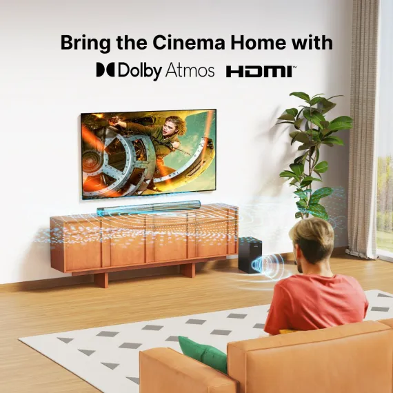Experience immersive, room-filling sound with the 4.1 Channel Soundbar with Dolby Atmos. Designed to elevate your home entertainment, this soundbar delivers powerful, multi-dimensional audio that puts you in the center of the action, perfect for movies, music, and games. With 280W peak power, a powerful subwoofer, and built-in DSP, it transforms stereo sound into immersive, multi-dimensional audio. The detachable design adapts to any room layout, while HDMI eARC and Bluetooth 5.3 ensure seamless, high-quality connections. Whether you're watching movies, gaming, or streaming music, enjoy bold, dynamic sound with customizable EQ and deep bass.