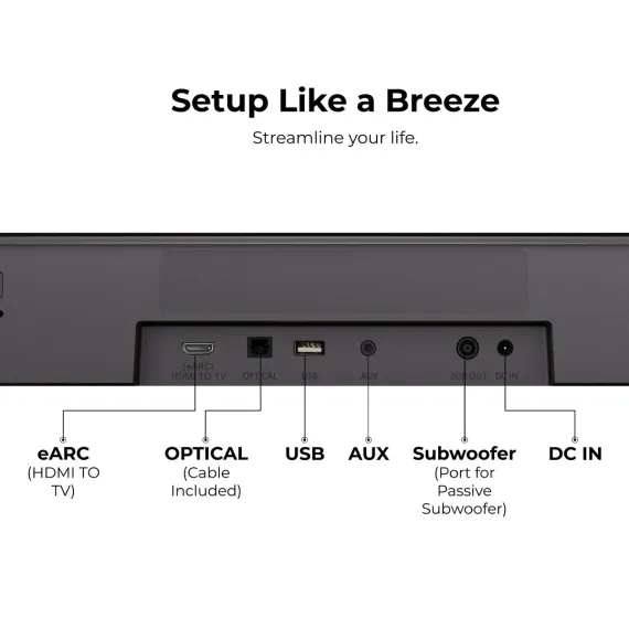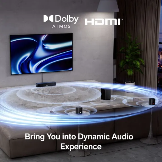 Experience immersive home theater sound with this 5.1 channel Dolby Atmos soundbar, featuring three main channels and two rear speakers for a dynamic, multidimensional soundstage. Dolby Atmos delivers 3D spatial audio that moves around you, enhancing direction, depth, and realism in every scene. With 320W peak power and a user-friendly setup, this system transforms your space within minutes, whether you're hosting movie nights or gaming marathons. HDMI eARC ensures lossless, low-latency audio transmission with perfect sync between sound and visuals-making this a complete upgrade for your smart TV setup.