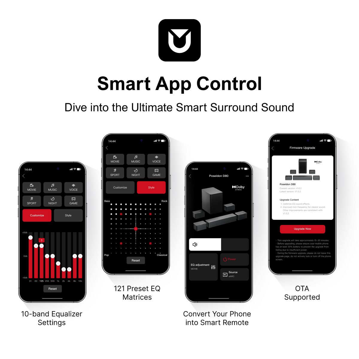 Immerse yourself in powerful, cinematic sound with the Poseidon D80. Featuring Dolby Atmos and 460W peak power, this 7.1-channel system delivers rich audio with deep bass and expansive range-making every scene come alive with detail and intensity. Simple to set up and designed for seamless integration, the D80 supports HDMI eARC, Bluetooth, and optical inputs, ensuring instant connectivity with all your devices. Whether you're watching movies, gaming, or streaming music, enjoy room-filling sound that puts you right in the heart of the action.