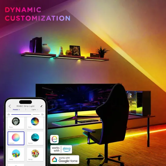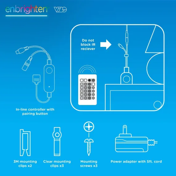 Color your world with Enbrighten VIBE Spectrum Strip Lights! Featuring easy customization and an effortlessly sleek design, this color-changing strip of RGBIC LEDs transforms your space, highlighting your own vibrant style. Using your 2.4GHz Wi-Fi network, experience hassle-free pairing to the Enbrighten app, which is available in the Apple App Store or on Google Play. Through the app, access an impressive array of colors, effects, speeds and preset modes, as well as dimming, scheduling, automations and voice activation with Amazon Alexa and Google Home. Additionally, the in-line controller and infrared (IR) remote control (CR2025 battery included) provide alternate ways to operate your strip lights. This 10ft. light strip can be cut to length and is easy to install indoors on a clean, dry surface using its adhesive backing and mounting clips. These flexible LED tape lights are the perfect way to enhance your gaming station, streaming setup, home theater, living room and more. The thin tape light can easily bend around corners as a colorful accent for desks, entertainment centers and baseboards or extended in a straight line. Experience the fun of smart, colorful indoor lighting with the Enbrighten VIBE Spectrum Strip Lights — where lighting meets lifestyle.