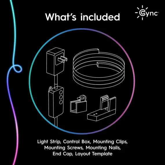 The GE Cync Full Color Dynamic Effects Neon Shape Light lets you bend and curve the strip to create a unique design. Create unique wall art by making shapes, designs, and words with our neon light. This smart light strip features scheduling, light shows, music sync and millions of colors to enhance any space – no hub needed. Select from a wide range of white color tones from 2000K to 7000K and pinpoint the perfect white light. Choose from millions of additional colors with this smart LED strip light to enhance the vibe in the room, ideal for entertaining and holiday décor. Enhance your entertainment space with our LED rope light by selecting a dynamic lighting effect and syncing to music to create the perfect atmosphere for a party, gaming, or working out. Get more out of your LED color changing lights with out of home control and scheduling through the intuitive Cync App, powered by Savant, and voice control when paired with Amazon Alexa or Google Home devices. The light comes with a power cord, control box, and mounting clips.