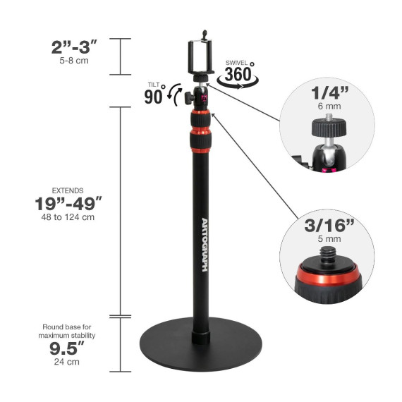 Equipped with both a standard 3/16" (5mm) bolt and a 360-degree swivel ball adapter with a 1/4" (6mm) bolt, the stand accommodates a range of devices and allows for 90-degree tilt in any direction. A spring-loaded phone holder expands from 2 to 3 inches, making it easy to secure your device for filming or viewing. The height adjusts from 19 to 49 inches, letting you tailor the setup to your specific needs—whether seated or standing. Easily rotate, angle, or reposition your gear to suit any creative task.
