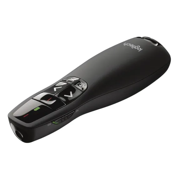 Logitech® Wireless Presenter R400 is designed to help you make your point. Its intuitive slideshow controls help you navigate through your presentation with confidence. Buttons are easy to find by touch. And its shape feels great in your hand. It’s got a red laser pointer that’s easy to see against most backgrounds and a range of up to 50 feet (15 meters), so you’ve got the freedom to move around the room and mingle with your audience. A storable plug-and-play wireless receiver makes it simple to get started—there’s no software to install. And when you’re through, the receiver stores inside the presenter to make packing up easy.