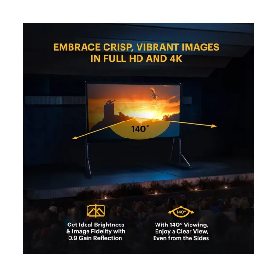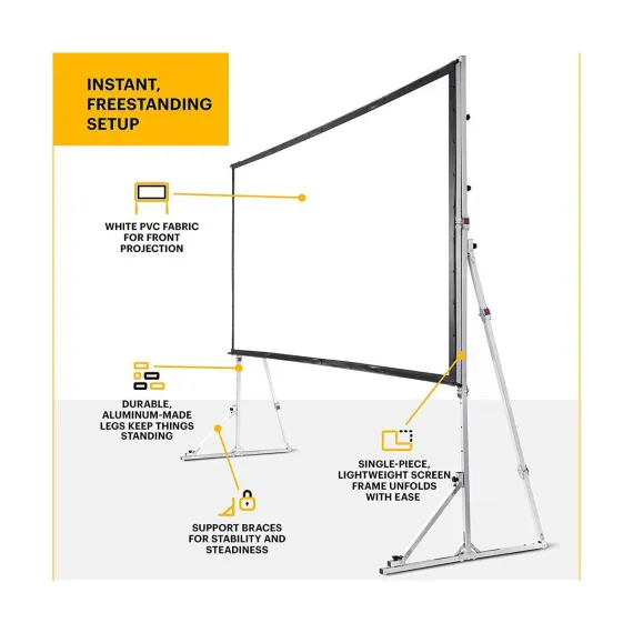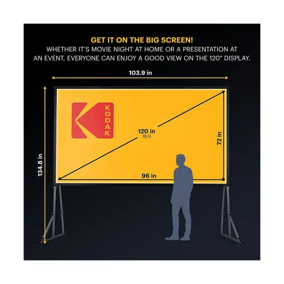Want to watch a movie or play some video games? Do all that and more with the Kodak 150” Indoor/Outdoor Portable Projector Screen With Stand. Assemble the portable screen for projector in just a few minutes, and set up a display indoors or outdoors for you and everyone around you. Embrace the quality of viewing this movie screen has to offer. Place your projector in front of this wrinkle-free, easy-to-clean portable movie screen and enjoy crisp, clear images right before your eyes. With a 0.9 screen gain and 16:9 aspect ratio, you can easily get a picture-perfect projection of slideshows, movies, TV shows, and more for all to see. Project movies, presentations, videos, and more, in the way that best suits you with the Kodak 150” Front Projection Screen Portable.