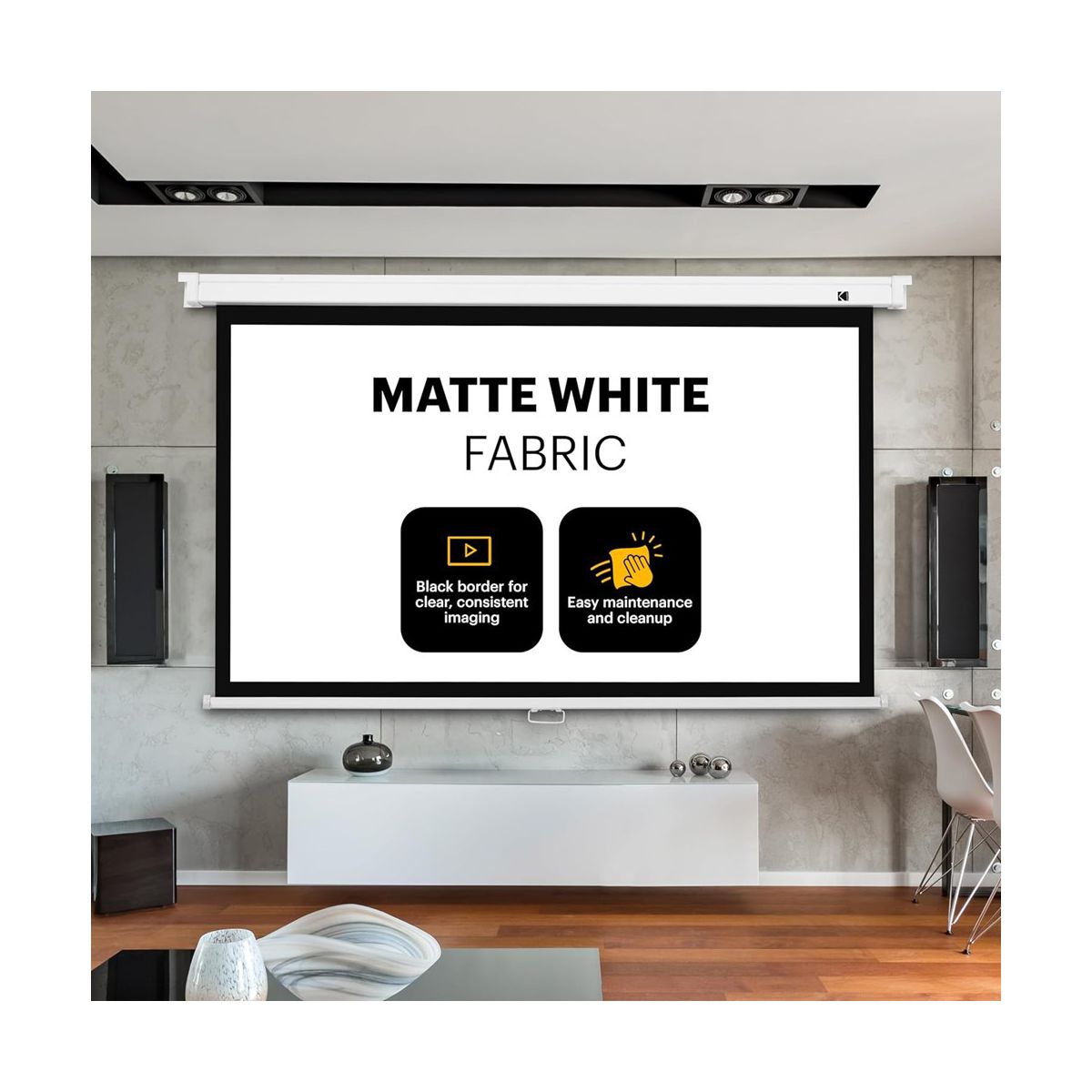 Enjoy big-screen entertainment on a small-screen budget with the Manual Pull-Down White Projector Screen Wall Mount from KODAK. Available in a variety of viewing dimensions, this classic retractable screen projector for room wall provides a dependable surface on which to project your favorite films, streaming shows, video games, as well as photographs and business presentations in stunning widescreen format. Universal styling makes it easy to mount against a wall in minutes or hang from the ceiling anywhere in the room. The wall projector screen roll down heavy-duty hardware and sturdy square casing withstand a lifetime of wear and tear, while the screen’s wrinkle-free matte fabric cleans like a dream (just wait for the credits to roll!).