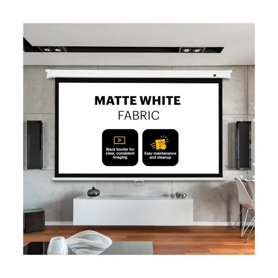 Enjoy big-screen entertainment on a small-screen budget with the Manual Pull-Down White Projector Screen Wall Mount from KODAK. Available in a variety of viewing dimensions, this classic retractable screen projector for room wall provides a dependable surface on which to project your favorite films, streaming shows, video games, as well as photographs and business presentations in stunning widescreen format. Universal styling makes it easy to mount against a wall in minutes or hang from the ceiling anywhere in the room. The wall projector screen roll down heavy-duty hardware and sturdy square casing withstand a lifetime of wear and tear, while the screen’s wrinkle-free matte fabric cleans like a dream (just wait for the credits to roll!). Whether you’re looking for a huge backdrop for outdoor concerts, an everyday wall mounted projector screen for the office, or a portable theater you can use for family movie nights and backyard block parties, manual operation gets the job done every time. Put simply, it’s the easiest solution for your supersized viewing pleasure. Add a KODAK Manual Pull-Down Projector Screen to your cart today!