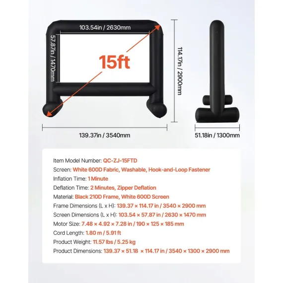 High-quality Material: This inflatable projector screen for outside uses high-quality Oxford fabric, which can resist creases and is easy to clean, ensuring clear, high-resolution images every time. The screen size is 8.62 x 4.82 ft. Front and rear projection are available with an aspect ratio of 16:9