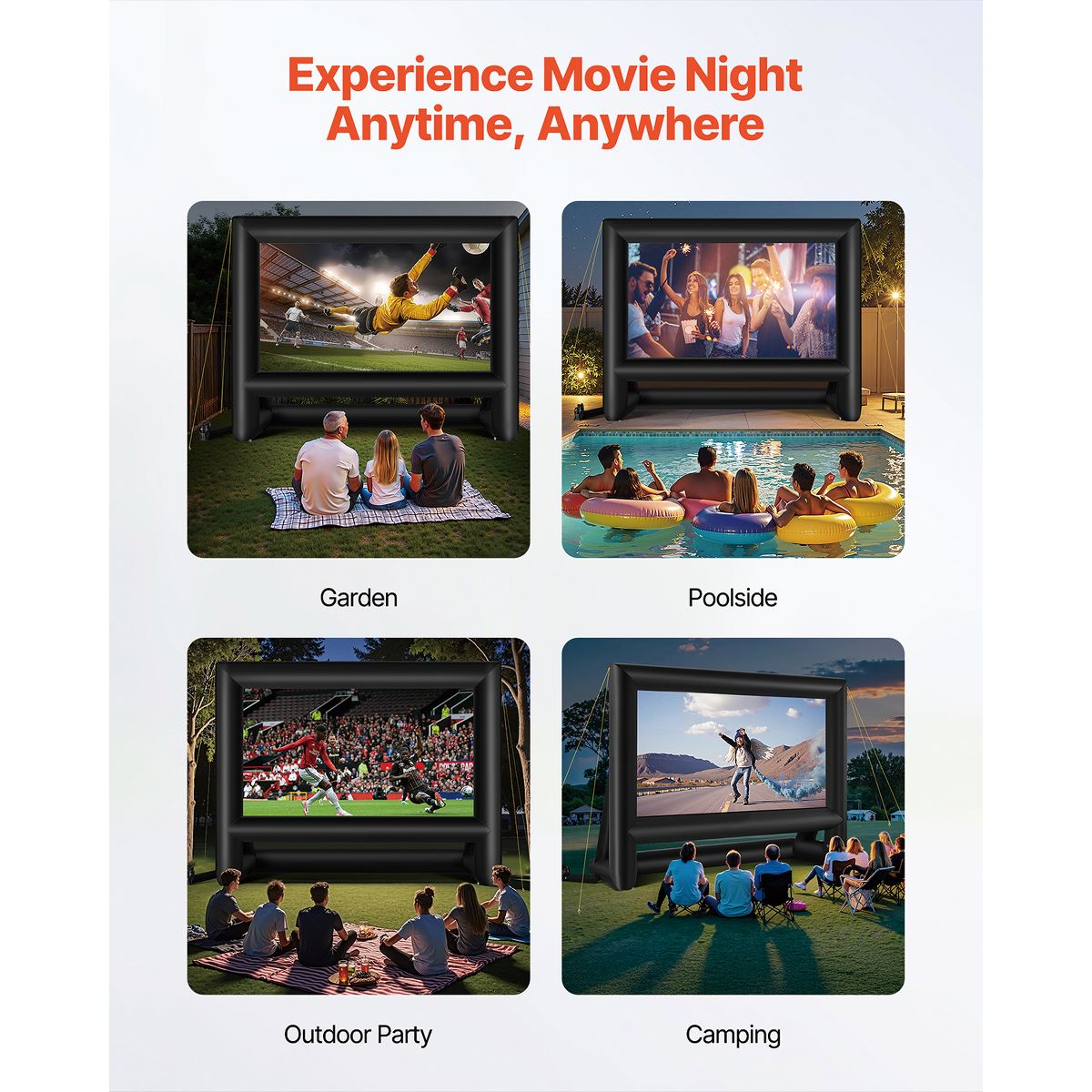 Various Applications: The projector screen is ideal for indoor and outdoor use, such as poolside, backyard, weddings, festive events, and parties. You can enjoy a fantastic night with people in the backyard, the beach, or have a camping adventure in the woods