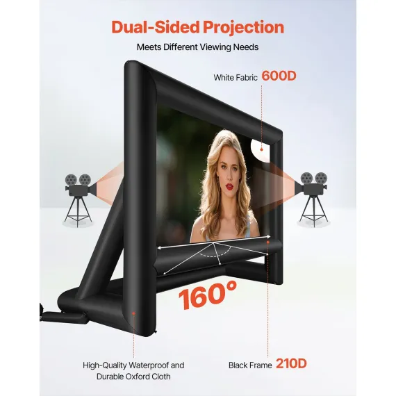 High-quality Material: This inflatable projector screen for outside uses high-quality Oxford fabric, which can resist creases and is easy to clean, ensuring clear, high-resolution images every time. The screen size is 12.66 x 7.11 ft. Front and rear projection are available with an aspect ratio of 16:9