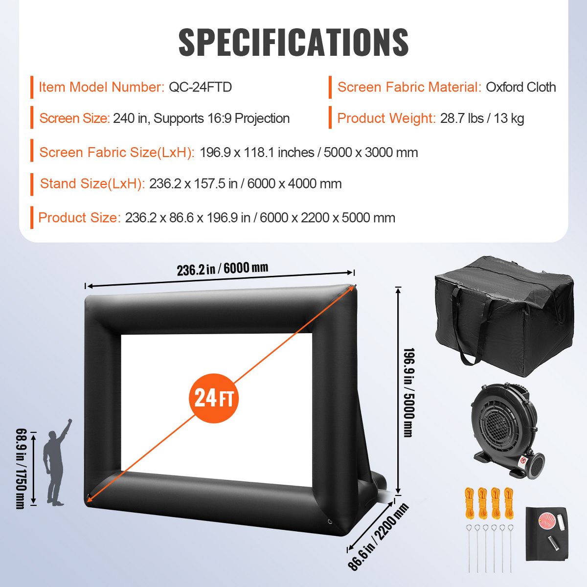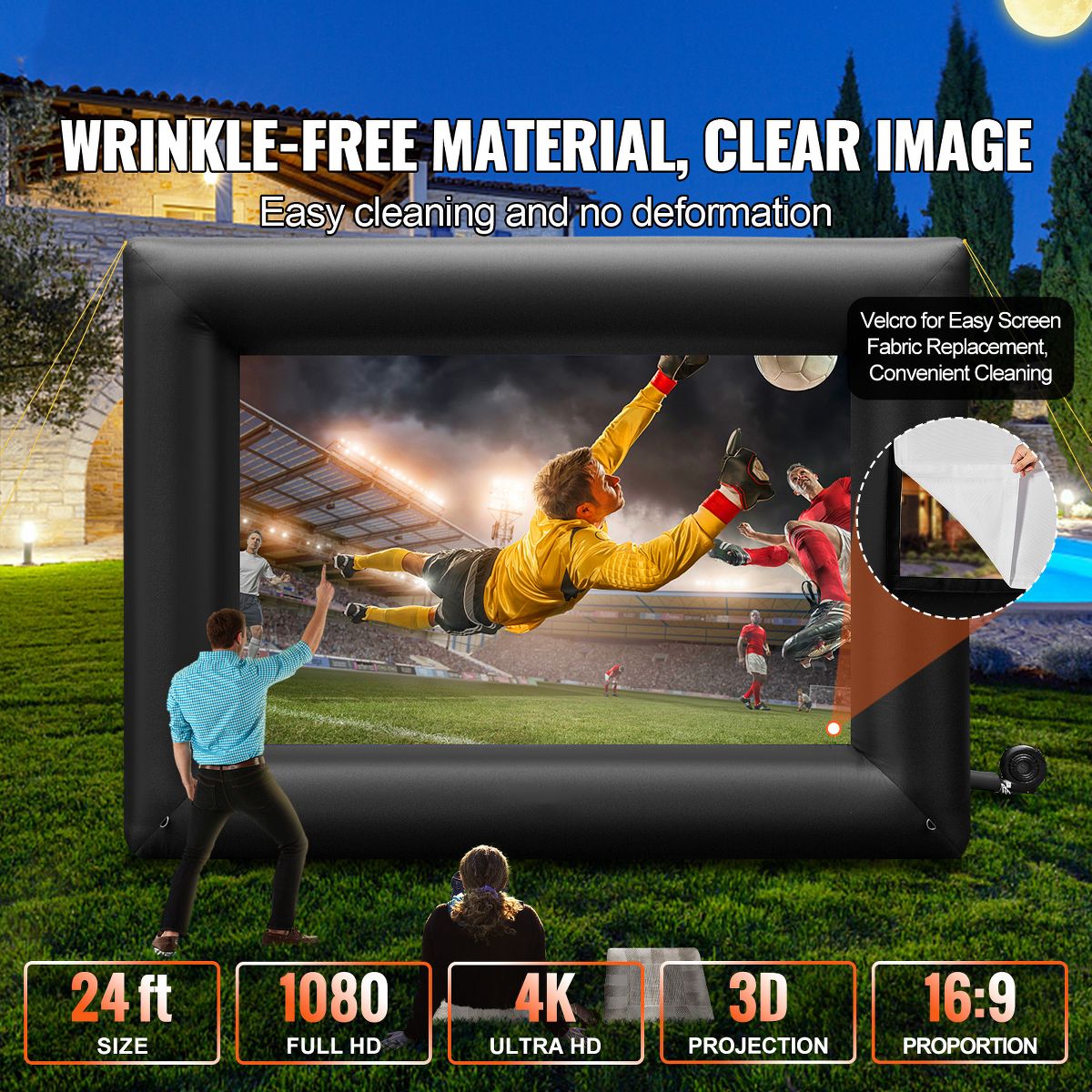 VEVOR Inflatable Movie Screen 24FT Inflatable Projector Screen for outside with 360W Air Blower Inflatable Screen Oxford Fabric Material, Black