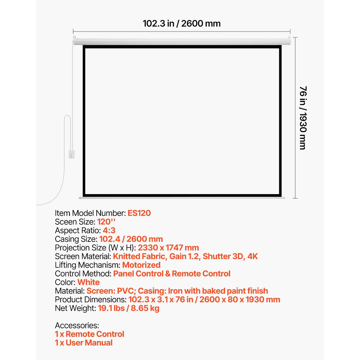 VEVOR Motorized Projector Screen, 120 inch 4:3 1080 HD Electric Projector Screen, Wall Mounted Projection Dispaly Projector, White