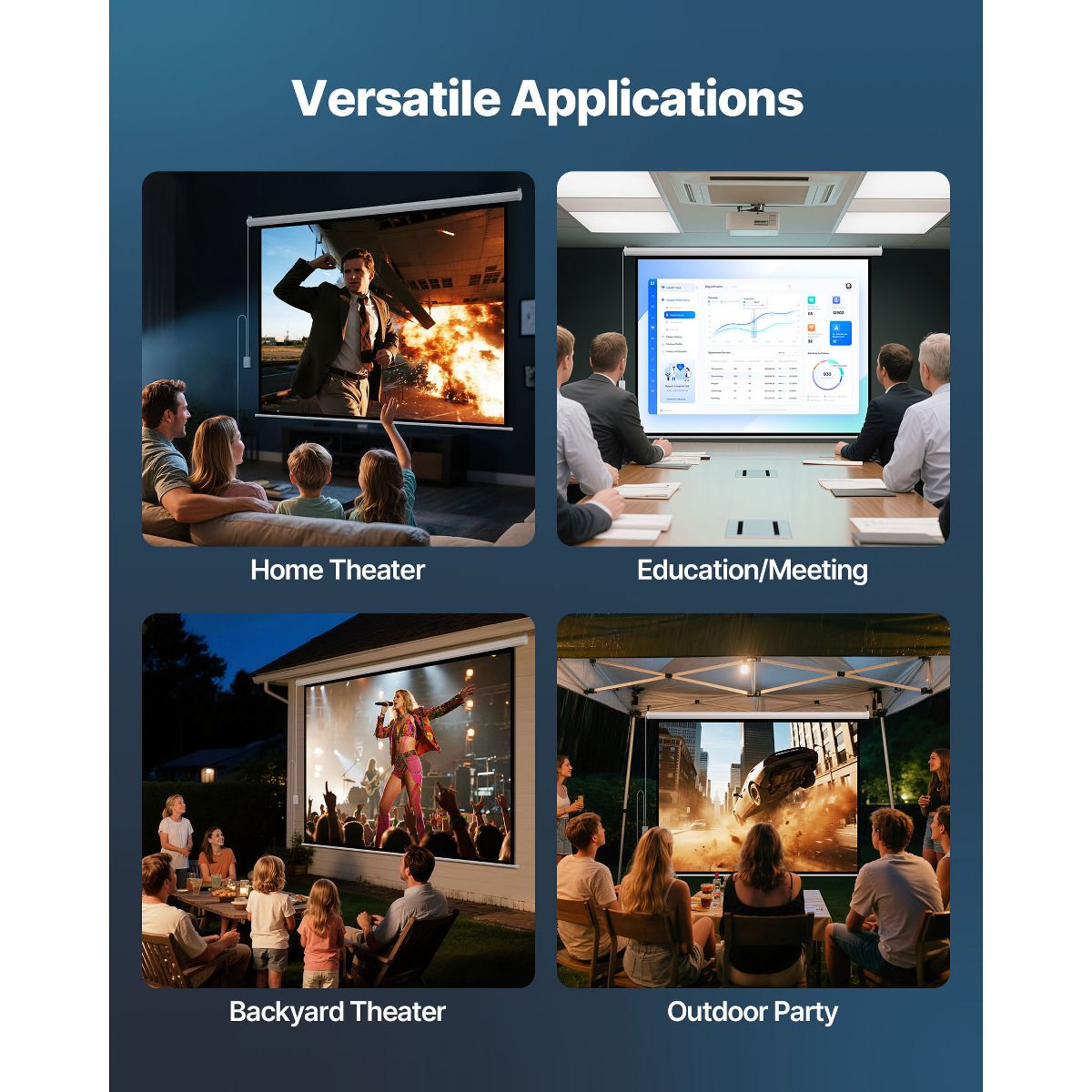 Versatile Use: Say goodbye to the limitations of small TVs or monitors. Our motorized projector screen provides a private cinema-quality visual anytime, anywhere. Whether you're indoors or outdoors, every viewer can experience vivid, crystal-clear visuals