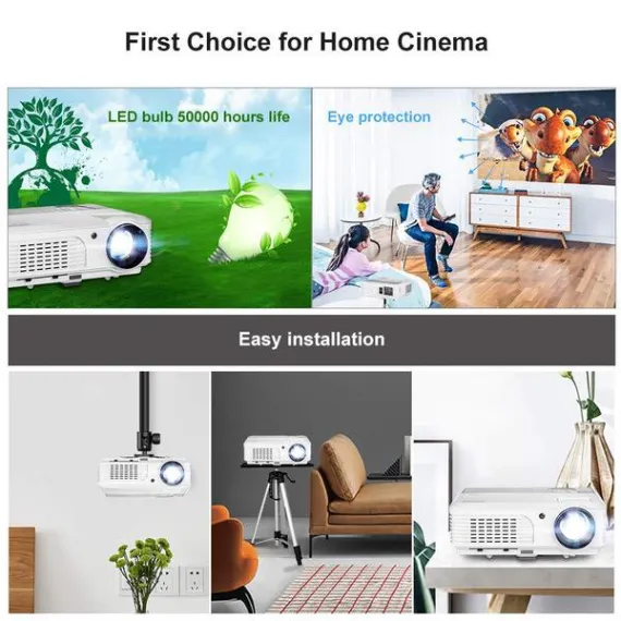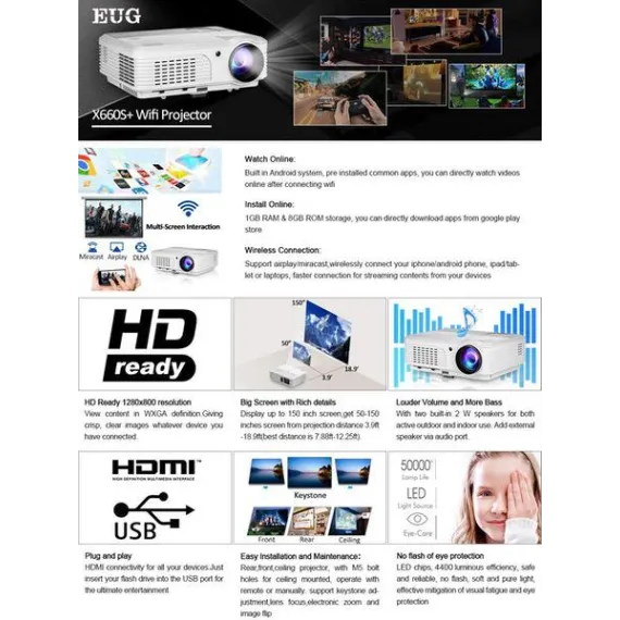 Make sure this fits by entering your model number. 【HD Projector for Smart Outdoor/Indoor Entertainment】 4400 LED luminous efficiency provides consistent brightness and color performance with increased. Wxga 1280*800 resolution,Max.support up to 1920*1200,and 5000:1 contrast, amazing watching experience,Much bigger than TV,: 50-200-Inch with projector distance 4.58ft-20.41ft. Built-in Dual 5W speakers, support Dolby Auido, Hd decode board,offer you immersive audio-visual feast. 【Upgraded 2019 Fast Android 6.0 OS】Based on Android OS, Provide powerful WiFi transmission & receiver technology , wifi capable,has a better compatibility of games and aplication programs, gives you access to YouTube, Netflix, Sling TV, HBO Now, VUDU, Hulu and more, let you enjoy games, films, Apps and browse the web without dropping a frame.Feature bluetooth 4.0, support Bluetooth speakers for better sound effects, Bluetooth-Mouse or Wireless Keyboard for more convenient using 【Wireless & Wired Connectivity-For Every Moment】HDMI-in & USB plug and play, fully compatible with (wired&wireless mouse or keyboard), iPhone, iPad, Smartphone, Mac, Tablet, Laptop, TV box, PC, Blu-ray/ DVD Player, Xbox, PS3, PS4, Wii, Firestick, Chromecast, TV, Speakers, USB devices, Roku and more, support Video:3GP, AVI, MKV, FLV, MOV, MP4, MPG, VOB, MPG, RMVB. Audio:MP3, WMA, ASF, OGG, AAC, WAV. Image: JPEG, JPG, BMP 【50,000-Hours Super Efficient LED Light Source consumes less power】 The LED is also 100% free of mercury and, as the bulb never needs to be replaced, there are no discarded bulbs. Built-in dual high performance 5W stereo speaker, RCA interface allows for external speaker connectivity. Project on Any Walls or Ceilings. Perfect for home entertainment. 【Hassle-Free After-sale Service】 With more than 11 years of experience in developing projectors, EUG has led the projector industry for decades. There is the most Professional R & D team and Technical after-sales team in our company. Internationally recognized standards for quality-【CE,FCC,CB,Rohs,PSE,CCC certificated】
