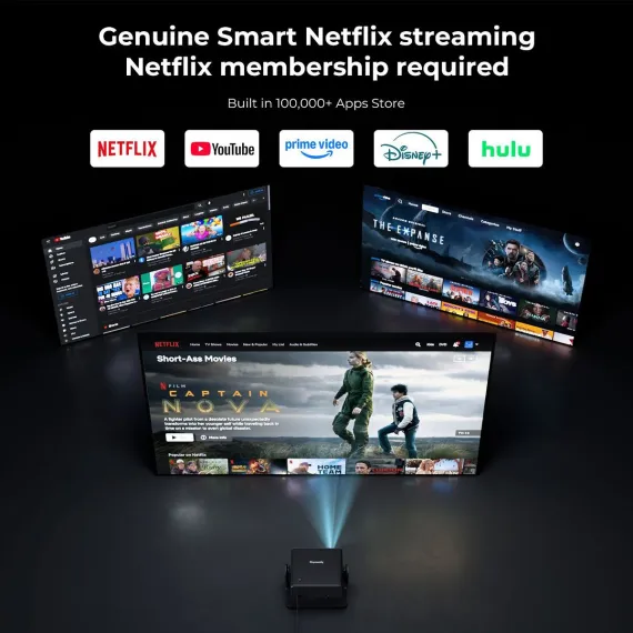 Smart Projector · New Home Theater Experience: This projector is equipped with autofocus and electric 4D/4P keystone correction function, which can present clear and square images when turned on. 1.1 Ultra short focal length projection ratio allows for the projection of a hundred inch screen even in small spaces, coupled with a 280 ° rotating base, making it easy to achieve multi angle projection on ceilings/side walls. Native 1080P high-definition picture quality compatible with 4K decoding, supports 50% -100% electric scaling, and allows for flexible viewing adjustments. Built in WiFi Bluetooth, can wirelessly project screens and connect audio devices, paired with 3D surround sound, instantly creating an immersive audio-visual feast. Built in intelligent system, one click access to massive applications, your efficient entertainment partner is in place!
