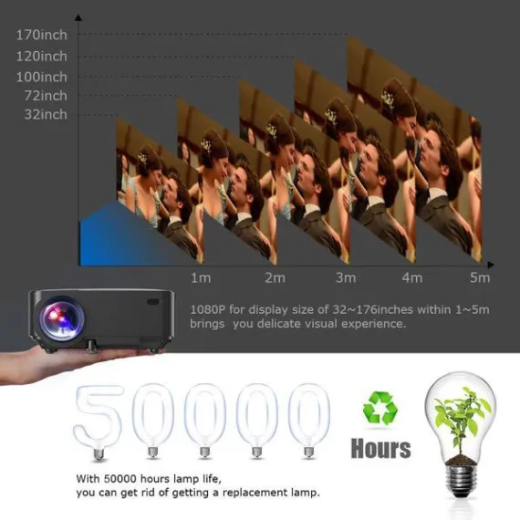 - Large screen Size - 1080p projector meaning you can enjoy your favorite movies on a screen size of between 32-176 inches with a projection distance of 1. 5-5M. An optimum distance of 1. 8 to 2. 0M s a super-clear and bright image