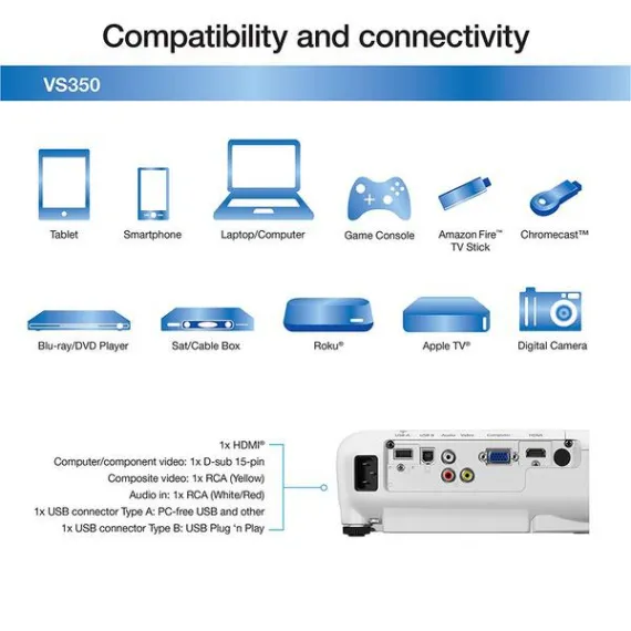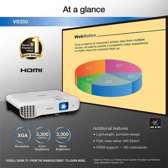 Epson VS350 XGA 3,300 lumens color brightness (color light output) 3,300 lumens white brightness (white light output) HDMI 3LCD projector