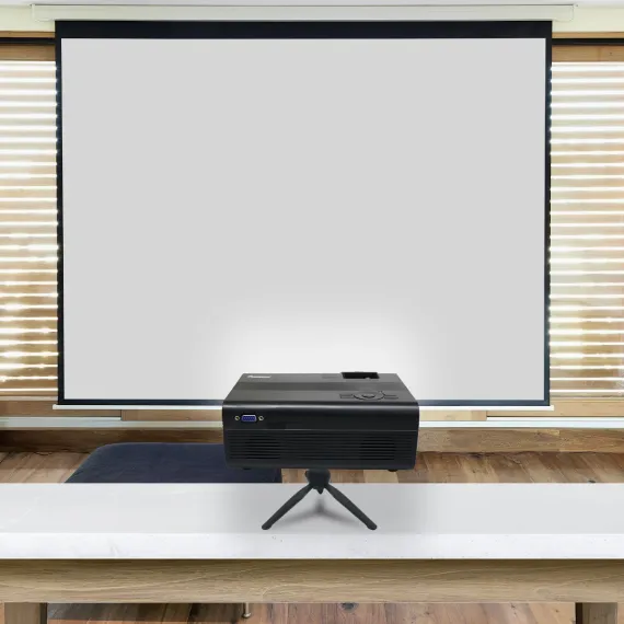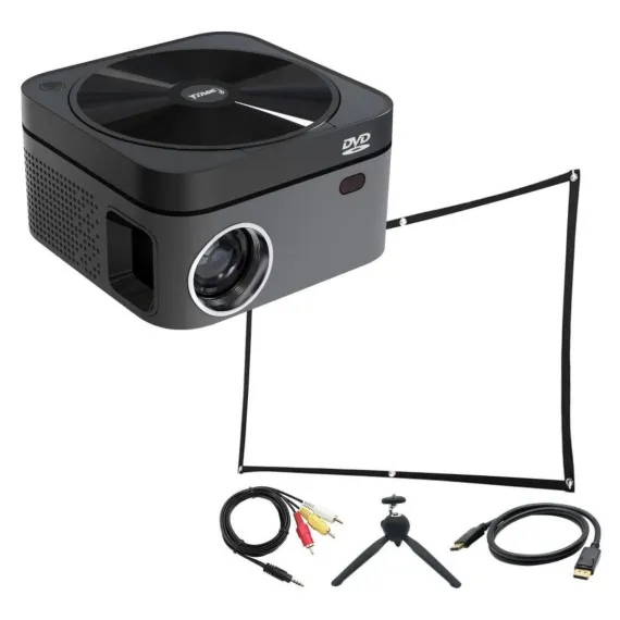 Elevate your home entertainment with IMPECCA DVD Home Theater Projector Bundle. This all-in-one package includes 1 high-performance LED projector with an integrated DVD player, delivering vivid 720p HD visuals and immersive sound right out of the box. Bundle includes: 100” white projector screen for cinematic experience, adjustable tabletop tripod to perfect projecting position, 6FT HDMI cable for high-definition connectivity via Laptop or computer, and AV cable assembly for versatile input options. Perfect for movie nights, gaming, or streaming. VP222KIT11 provides everything you need for a stunning home theater setup.