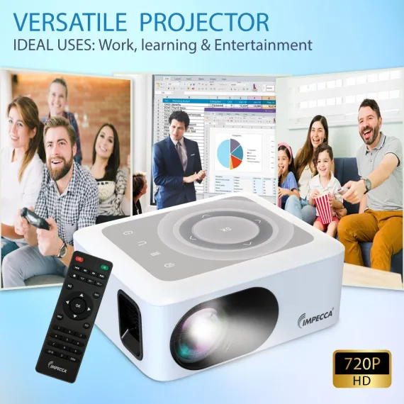 Impecca Portable Home Theater Projector, 80 ANSI Lumens, 720P, up to 120”