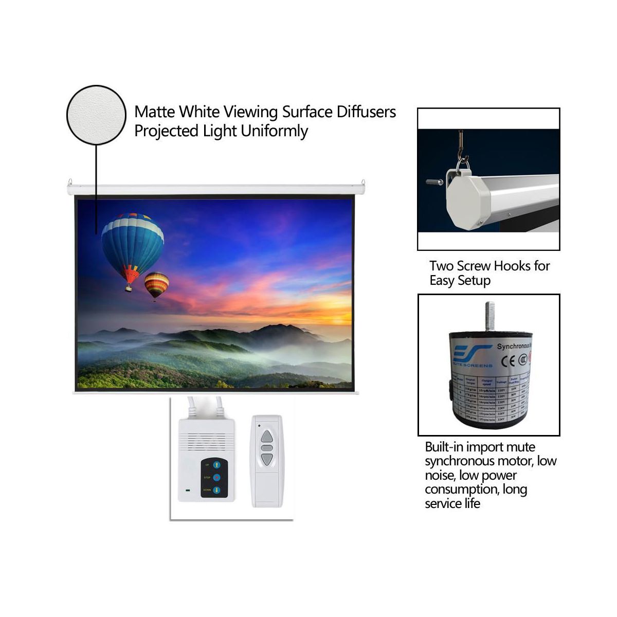 100inch 4:3 80inch x 60inch Viewing Area Motorized Projector Screen with Remote Control, can offer you a perfect visual enjoyment with optimal image and color reproduction. It is ideal for home theater movies, classroom training, conference room presentations, public display, etc. High quality matte white surface provides 80inch x 60inch of viewing area with 4:3 aspect ratio. It features high quality matte white viewing surface, which diffuses projected light evenly. Take this one back for enjoying your leisure time!