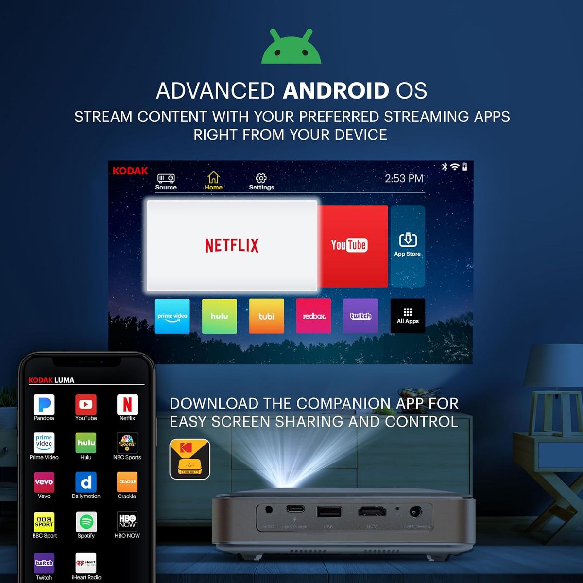 Kodak Luma 450 Smart Projector, Full HD Portable Pico Projector with Tripod, Remote & Carrying Case