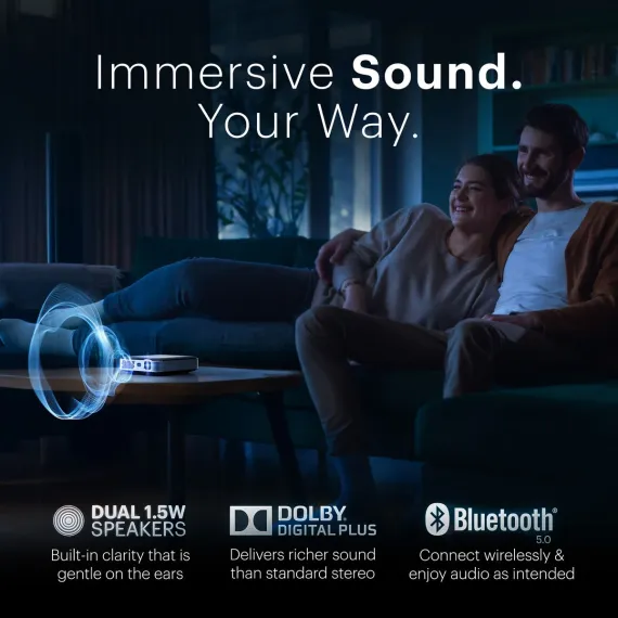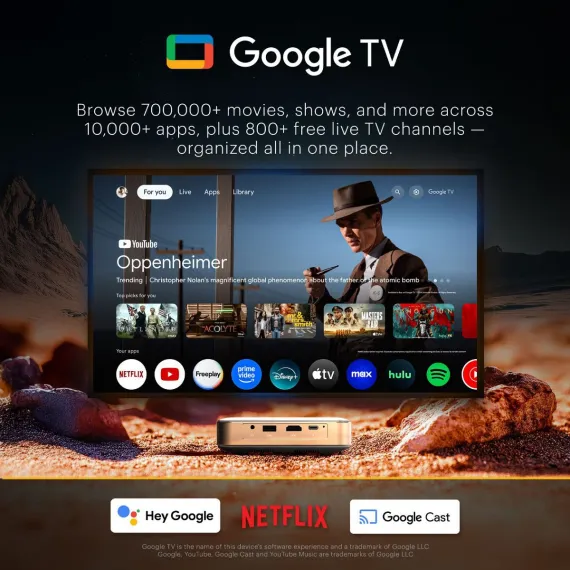 Powered by Google TV 11.0 OS, this mini projector lets you stream your favorite TV shows, movies, games, and more in stunning native 1080p resolution with 4K support. Enjoy crystal-clear images and vibrant colors thanks to its 150 ANSI lumens brightness and 400:1 contrast ratio. The Kodak Luma 500 is Netflix Certified and comes equipped with built-in Chromecast, Wi-Fi, Bluetooth 5.0, HDMI, and USB compatibility, making connectivity seamless across all your devices. Whether you're hosting a backyard movie night, giving a business presentation, or gaming with friends, the projector’s screen size up to 150”, auto-focus, auto keystone correction, and manual 4-corner adjustment ensure a perfect display from virtually any angle. Stream over 400K apps from Google Play, control the projector with your phone via the Google TV app, and enjoy features like personalized recommendations, multi-user support, and cross-platform continuity. Built with DLP technology and an RGB LED light source rated for a 30,000-hour lifespan, the Kodak Luma 500 guarantees years of cinematic fun.