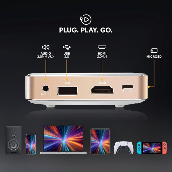 Experience stunning HD video and imaging in the palm of your hand with the KODAK Small DLP Pocket Projector. This compact mini projector delivers high-quality visuals with a dazzling 16.7 million color display and a built-in 1W speaker for immersive sound. Featuring HDMI, USB, MicroSD, and 3.5mm inputs, it’s compatible with PCs, Macs, gaming consoles, and more. Its ultra-portable, rechargeable design lets you enjoy a home theater experience anywhere—perfect for movies, presentations, travel, or camping. Just plug, play, and explore a pocketful of cinematic possibilities.