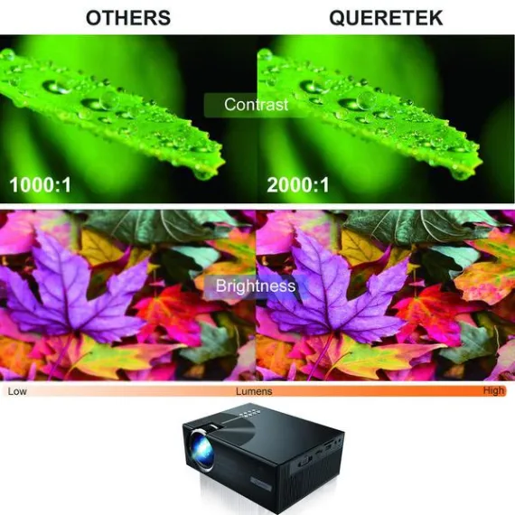 - [Higher Clarity & Resolution for Better Visual Experience]: Queretek Projector utilizes the brand new LED light source and LCD display technology, which significantly reduces light attenuation and provides +80% brightness and sharper image +30% than ordinary projector. 50-180” big screen display at the distance of 1.0M-4.5M. (the recommended viewing distance is 3.0M with 100”display.) It is ideal HD projector for home entertainment ! (Notice: Not recommend for PPT or office presentation.)
