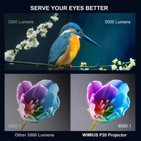 Projector, WiMiUS P20 Native 1080P LED Projector, 5000 Lux Movie Projector Support 4K Video 300" Display ±50°Digital Keystone Correction 70,000 Hrs for Home Entertainment & PPT Business Presentation