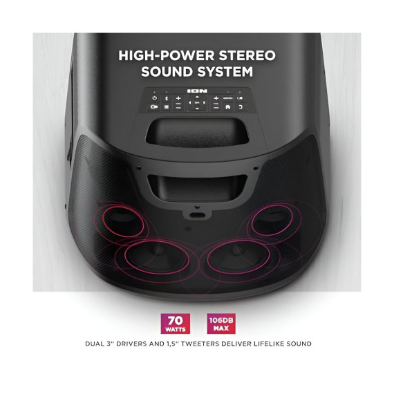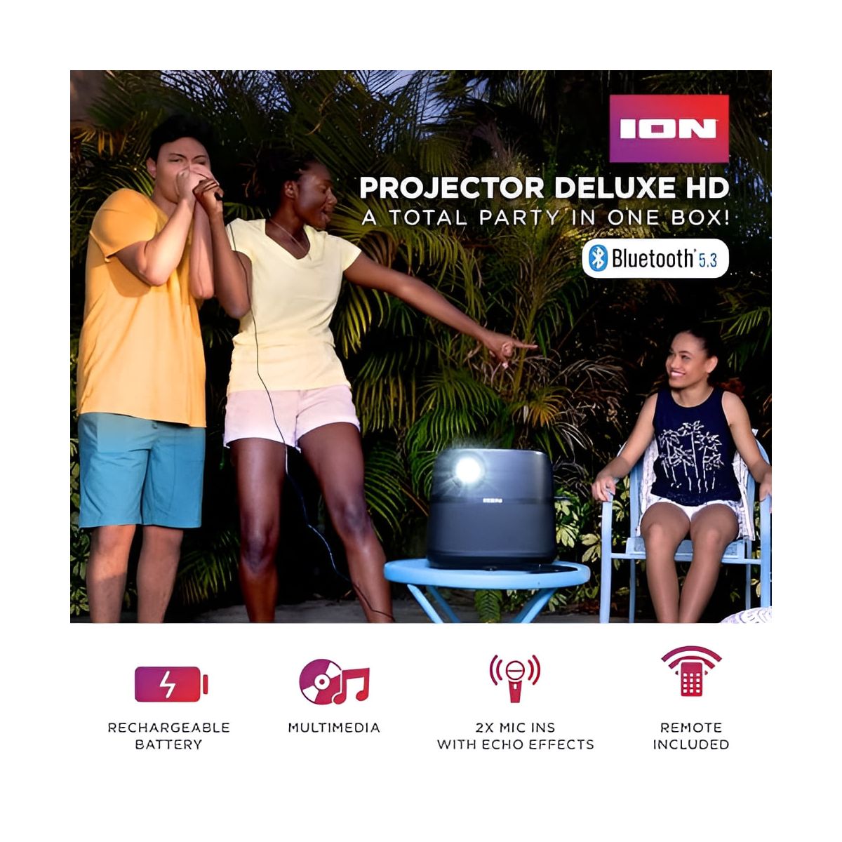 ION Audio Projector Deluxe HD - Battery/AC Powered 720P HD Bluetooth-Enabled Projector with Powerful Speaker! With an amazing built-in speaker, your room will come alive with great sound as well as terrific visuals. If you want to simply listen to music, the Projector Deluxe HD with powerful speaker can stream your music wirelessly from any Bluetooth-enabled device for the ultimate convenience. A high-quality microphone is also included for instantaneous Karaoke, and it includes two 1/4" mic inputs with vocal and echo effects for duets. You and your friends will never sound better behind the mic!