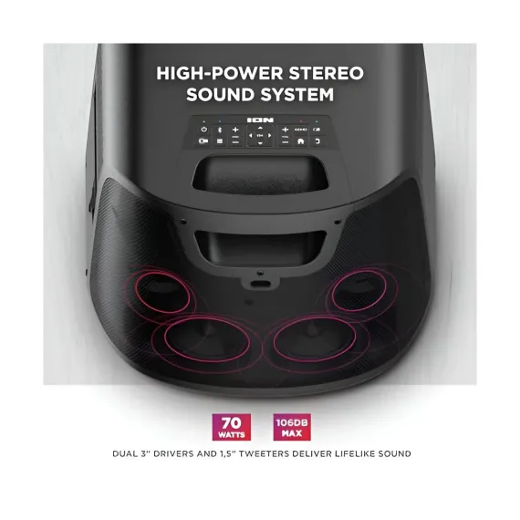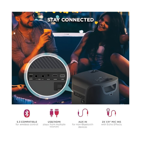 • Play movies, video games, karaoke and more anywhere, indoors or out, with this high-power multimedia 70-Watt Stereo Speaker with built-in 720p HD LED Projector!