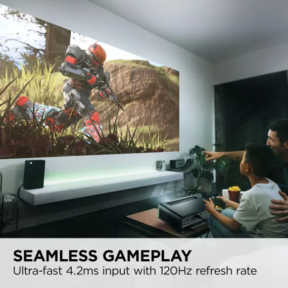 Unlock the ultimate entertainment experience with the X1-4KPro smart LED projector. This "Designed for Xbox" projector comes with integrated Google TV so you can not only play your favorite games, but also stream your favorite shows and movies in stunning 4K resolution – no external dongle required. With a fast 240Hz refresh rate, it’s built to provide ultra-smooth visuals for both high-speed action games and fast-paced movies on a screen up to 150”. This home entertainment projector was also designed in partnership with Microsoft for optimized Xbox gameplay: 1440p native Xbox resolution at a 120Hz refresh rate delivers the perfect balance between incredible visuals and accuracy for Xbox gaming. Plus, with next-generation LED technology, you can enjoy pristine image clarity for years to come without performing any maintenance or upkeep. And, with features like vertical lens shift, 1.36x optical zoom, and four-corner adjustment, you can effortlessly build the entertainment setup of your dreams. Level up the way you watch, play and relax with the X1-4KPro projector today. ***** Manufacturer Refurbished Product. Please note that this is a pre-owned item. - Manufacturer Refurbished
